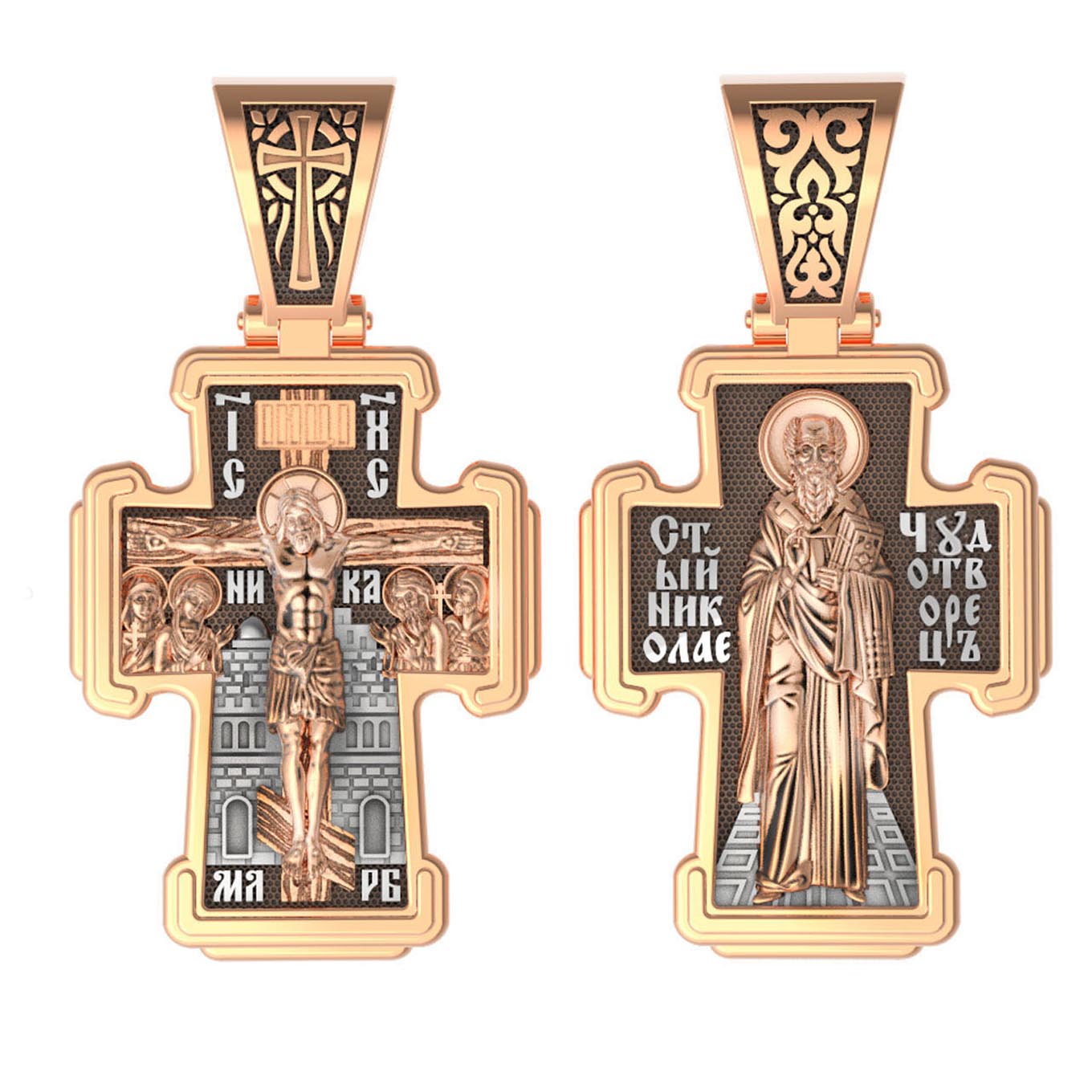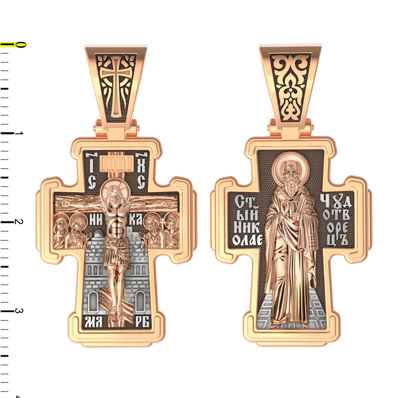 На лицевой стороне креста изображено Распятие Господа и Спасителя нашего Иисуса Христа. Крест- символ спасения и искупления рода человеческого, знамение победы над смертью и адом. Иисус Христос, как искупительная жертва освобождения человечества от власти греха, умер крестной смертью и в третий день воскрес. На верхней табличке, выше головы Иисуса, расположена надпись, составленная Понтием Пилатом — «IНЦI». Она означает «Иисус Назорей, Царь Иудейский». Рядом расположена надпись «IС» « ХС». Она означает Иисус Христос. Ниже — слово «НИКА», что означает «победитель». Слева от Распятия — Пресвятая Богородица и святая мироносица Мария Магдалина с крестом в руке. Справа — апостол и евангелист Иоанн Богослов, один из ближайших учеников Иисуса Христа, и сотник Лонгин с крестом в правой руке и копьем — в левой. За крестом высится Иерусалимская стена. Надпись «МЛРБ» — «место лобное рай бысть» означает, что место лобное стало раем, помещается в нижней части креста. На кулонном кольце помещен крест.