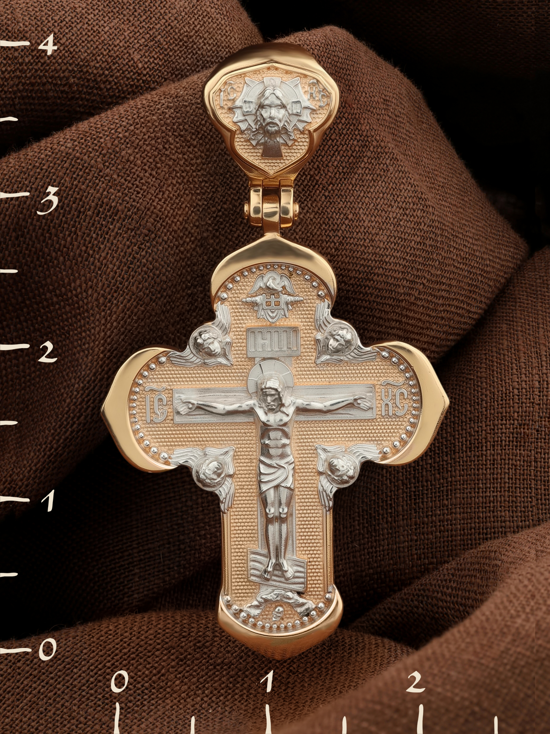 На лицевой стороне креста изображено Распятие Господа и Спасителя нашего Иисуса Христа, отдавшего Себя на смерть, для искупления грехов мира. Крест является символом жертвенной любви Всеблагого Бога к падшим людям, всепобеждающим духовным оружием христиан, основанием и средоточием церковной жизни. Господь сказал: «кто хочет идти за Мною, отвергнись себя, и возьми крест свой, и следуй за Мною». (Мк. 8: 34). На верхней табличке, выше головы Иисуса, расположена надпись, составленная Понтием Пилатом — «IНЦI». Она означает «Иисус Назорей, Царь Иудейский». Надпись «IC» «ХC», означает Иисус Христос, помещается на разных сторонах поперечной перекладины креста. Крест стоит на горе камней, символизирующих Голгофу. В ее основании различается череп– это голова Адама. На кулонном кольце изображен Нерукотворный образ Господа и Спасителя нашего Иисуса Христа, чудесно отпечатавшийся на плате, которым Христос вытер свой лик.