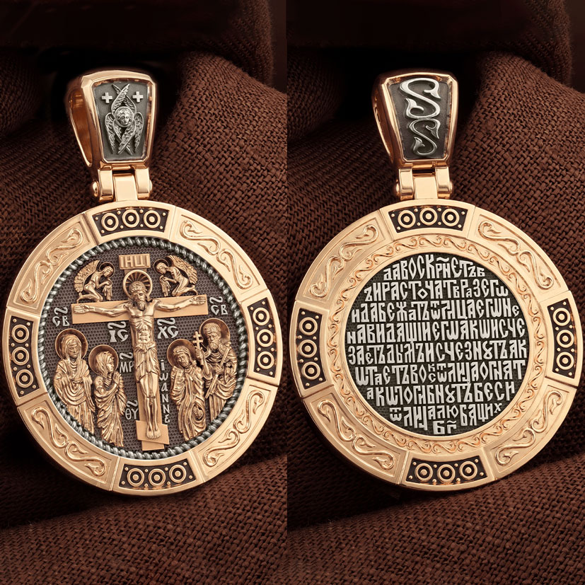 На лицевой стороне образка изображено Распятие Господа Иисуса Христа с предстоящими Ему святыми, которые, по преданию, находились у Креста Господа во время Его казни. Слева — Пресвятая Богородица и св. Мария Клеопова, справа — апостол Иоанн Богослов и мч. Лонгин Сотник.