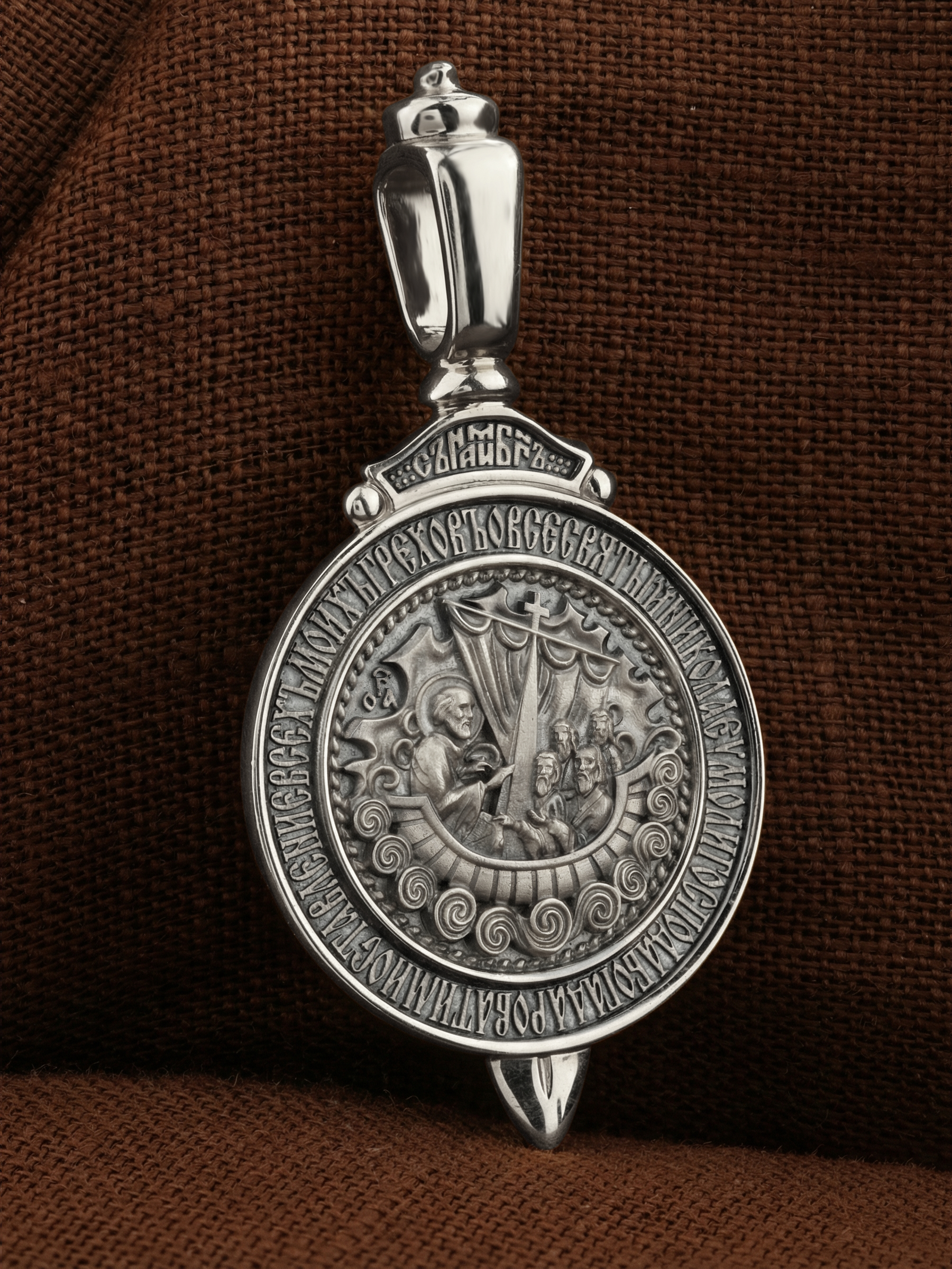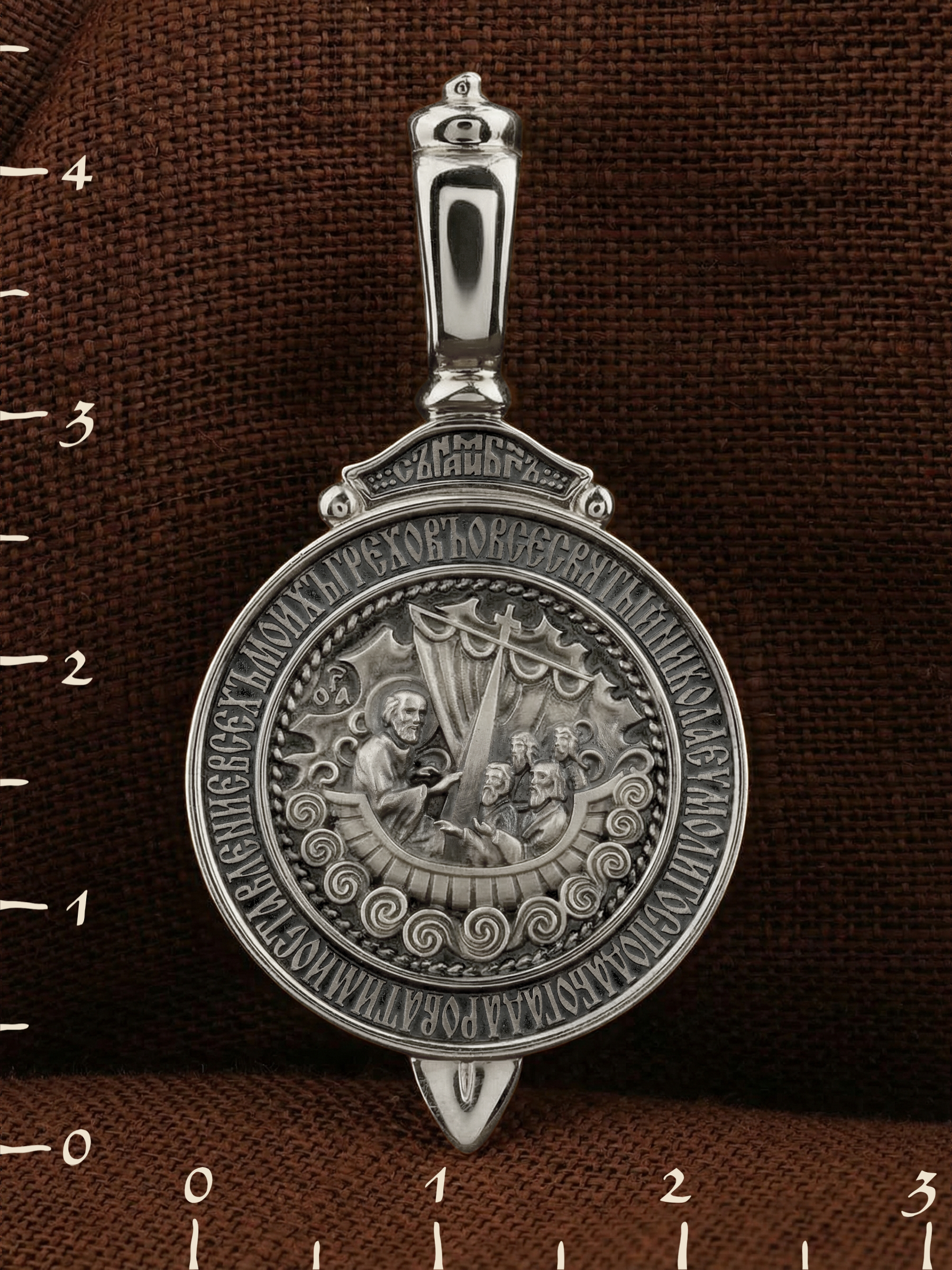 На обороте изображена икона «Чудо спасения трех корабельщиков». Икона рассказывает о том, как погибающие в море купцы обратились за помощью к свт. Николаю и были чудесно им спасены. Сначала они были, как пророк Иона, проглочены рыбой, потом «исплюнуты» ею на поднявшийся из морских пучин камень, а затем на камне, как на корабле, доставлены к городу. Правитель города, узнав о злодействе грабителей-корабельщиков, наказал их и вернул купцам товары. Вокруг — слова молитвы: «О Всесвятый Николае, умоли Господа Бога даровати ми оставление всех моих грехов».