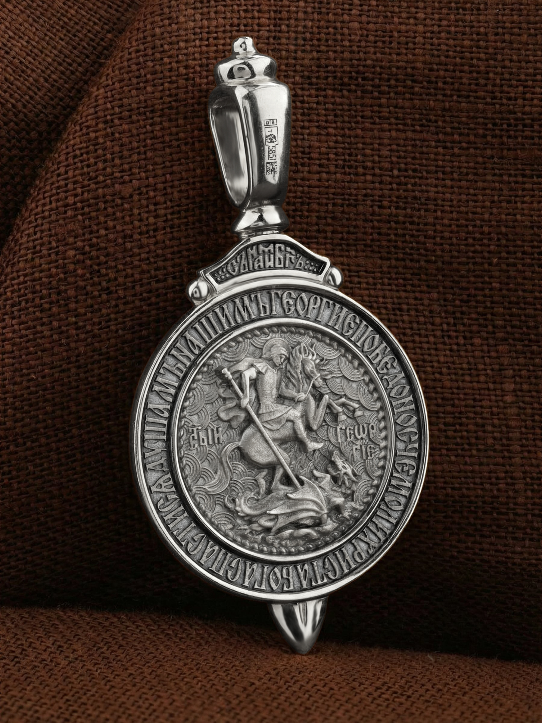 Основой композиции лицевой стороны является изображение Святого Георгия Победоносца. Святой Георгий один из наиболее почитаемых святых в Христианской Церкви. На Руси он известен как Юрий или Егорий, покровитель воинов, помощник в крестьянском труде. На образке изображено самое знаменитое чудо святого: спасение принцессы от змея, которому она предназначалась в жертву. Чудо это имеет символическое толкование. Принцесса означает душу человеческую, а змей — дьявола, желающего ее поглотить. Святой Георгий, небесный защитник, спускается с Небес, чтобы помочь душе избавиться от гибели. По контуру образка написана молитва: «Геогрие Победоносче, моли Христа Бога спастися душам нашим».