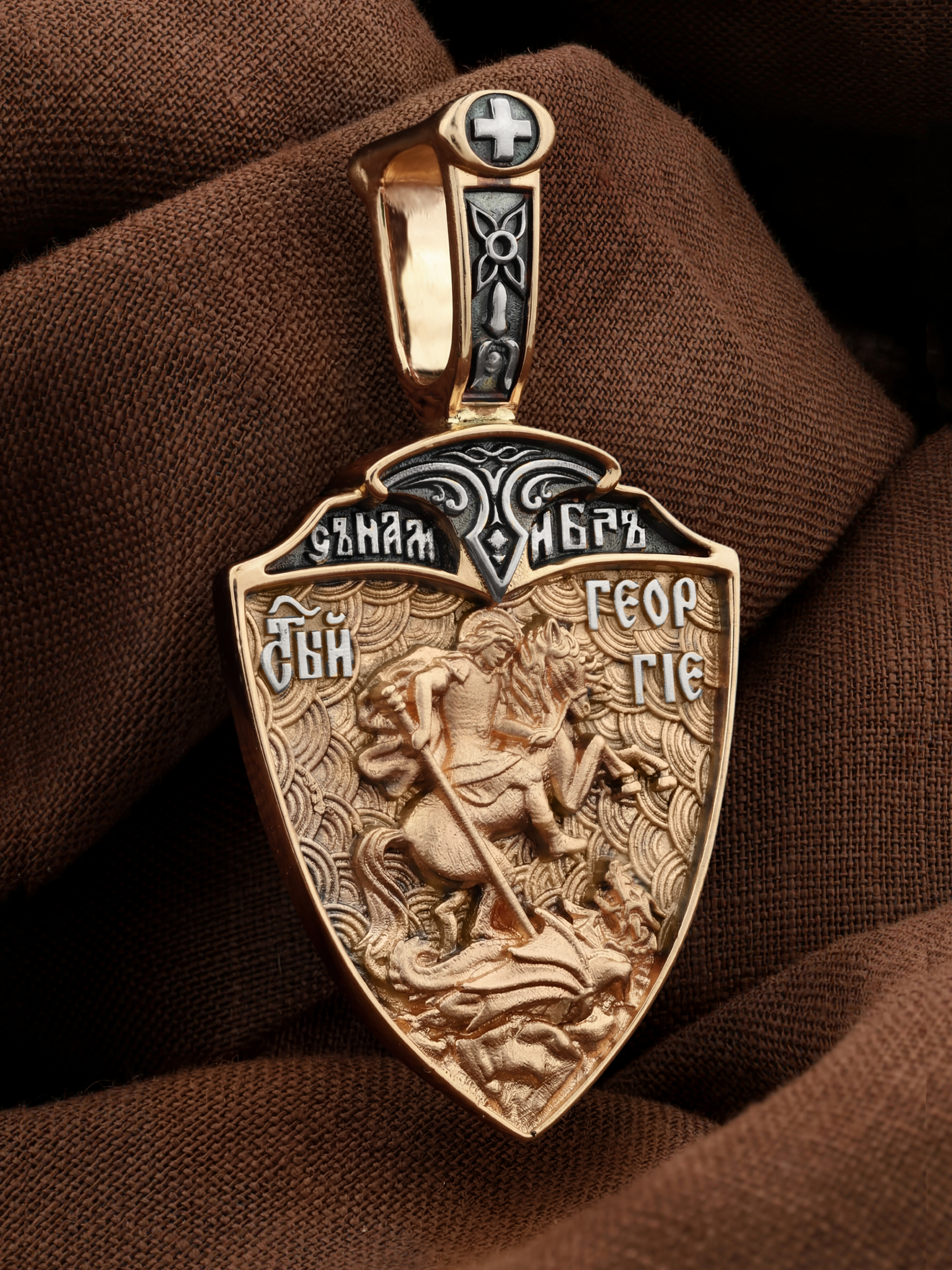 Основой композиции оборотной стороны является изображение Святого Георгия Победоносца. Святой Георгий один из наиболее почитаемых святых в Христианской Церкви. На Руси он известен как Юрий или Егорий, покровитель воинов. На образке изображено самое знаменитое чудо святого: спасение принцессы от змея, которому она предназначалась в жертву. Чудо это имеет символическое толкование. Принцесса означает душу человеческую, а змей — дьявола, желающего ее поглотить. Святой Георгий, небесный защитник, спускается с Небес, чтобы помочь душе избавиться от гибели. Образ святого воина венчают слова: «С нами Бог!». Они написаны у рукоятки меча, узорчатый клинок которого разделяет образок на две части. Сам образок имеет форму щита. Щит и меч — это символы духовной брани с дьяволом.