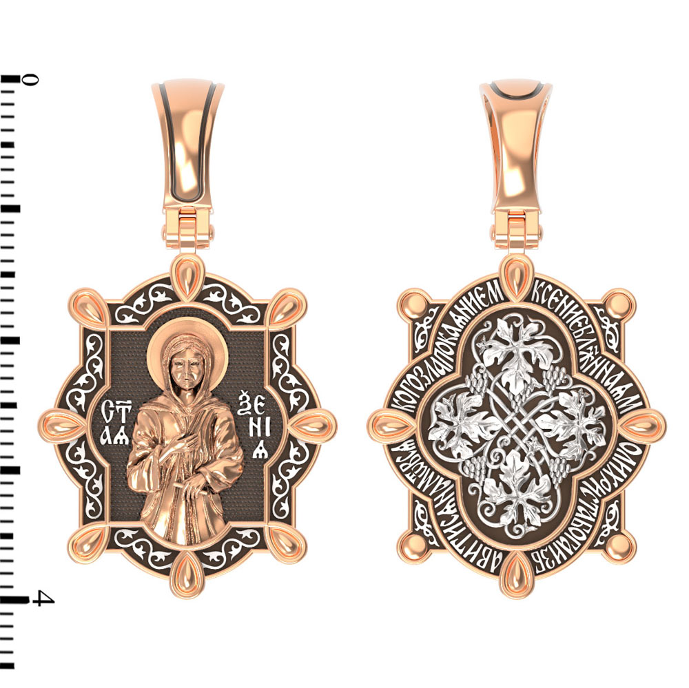 На оборотной стороне изображена виноградная лоза — символы церкви и евхаристии. «Я есмь лоза, — говорил Иисус Христос Своим ученикам, — а вы ветви; кто пребывает во Мне, и Я в нем, тот приносит много плода» (Ин. 15, 5), «Я есмь истинная виноградная лоза, а Отец Мой — виноградарь». Вокруг образка написана молитва: «Ксение блаженная, моли Христа Бога избавитися нам от всякаго зла покаянием».