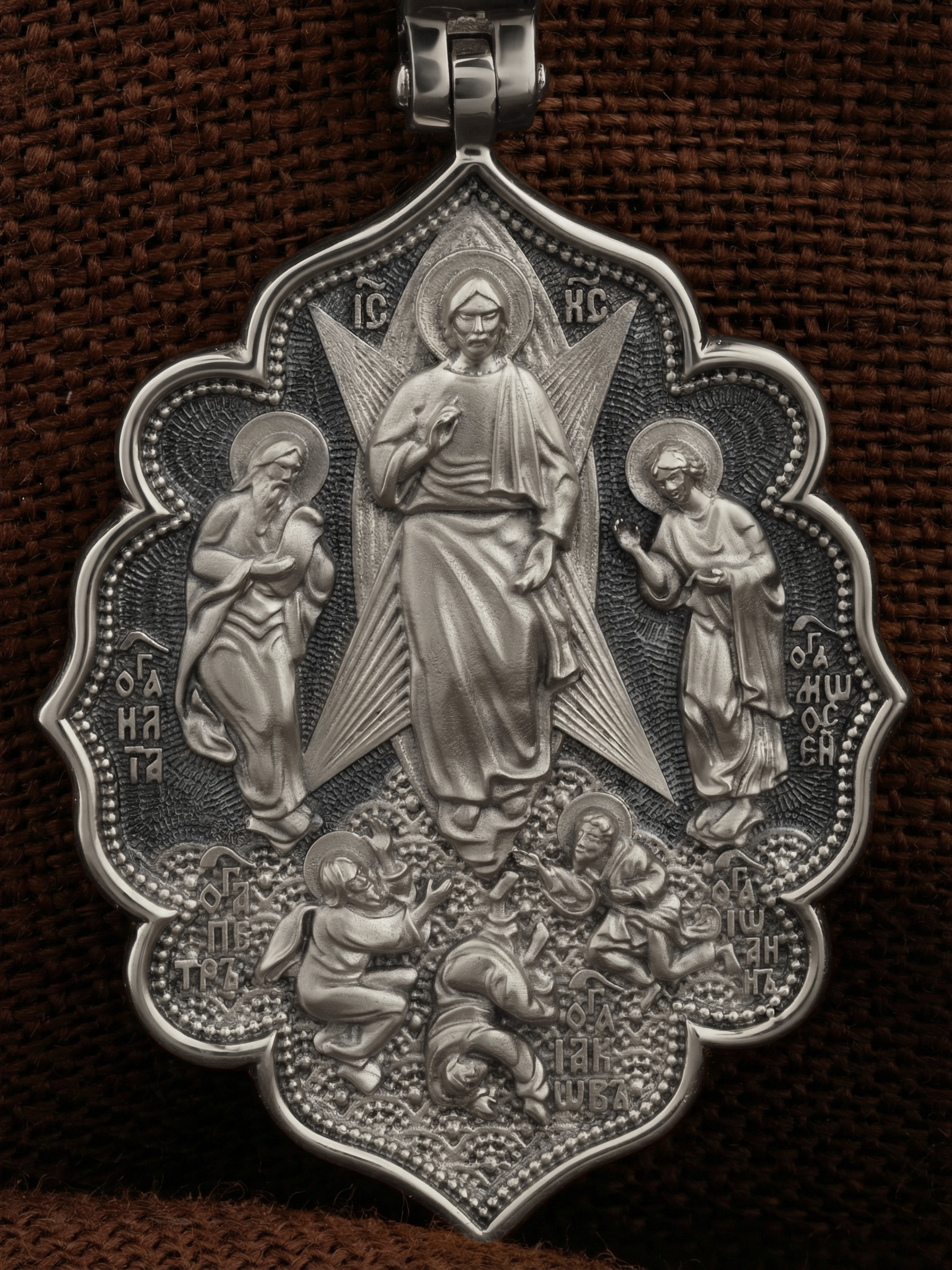 На лицевой стороне образка изображена икона «Преображение». Образ являет Господа Иисуса Христа в тот момент, когда Он предстал трем Своим ученикам: Петру, Иакову и Иоанну Богослову. Пророки Моисей и Илия предстояли рядом и беседовали с Ним. Апостолы едва могли вынести бесконечную радость, которая охватила их в присутствии Бога. Когда же на гору спустилось облако и раздался глас Божий: «Сей есть Сын Мой Возлюбленный; Его слушайте», апостолы в сильном страхе пали на землю (Лк. 9:35). На иконах «Преображение» они так и изображаются — лежащими у ног Христа.