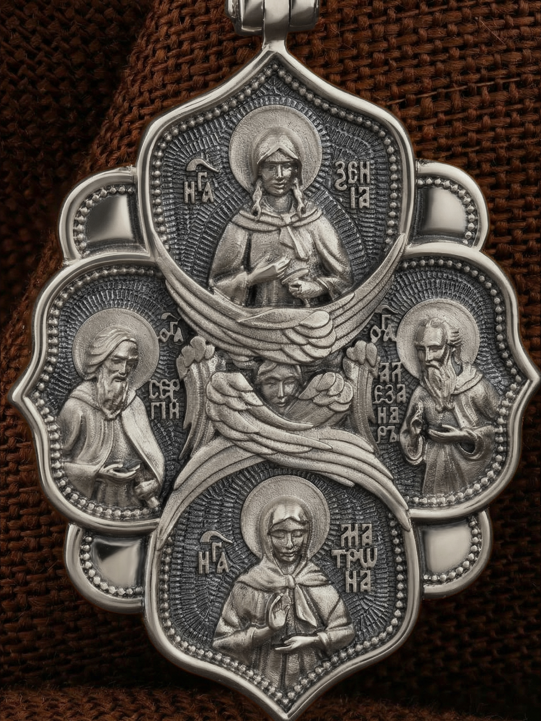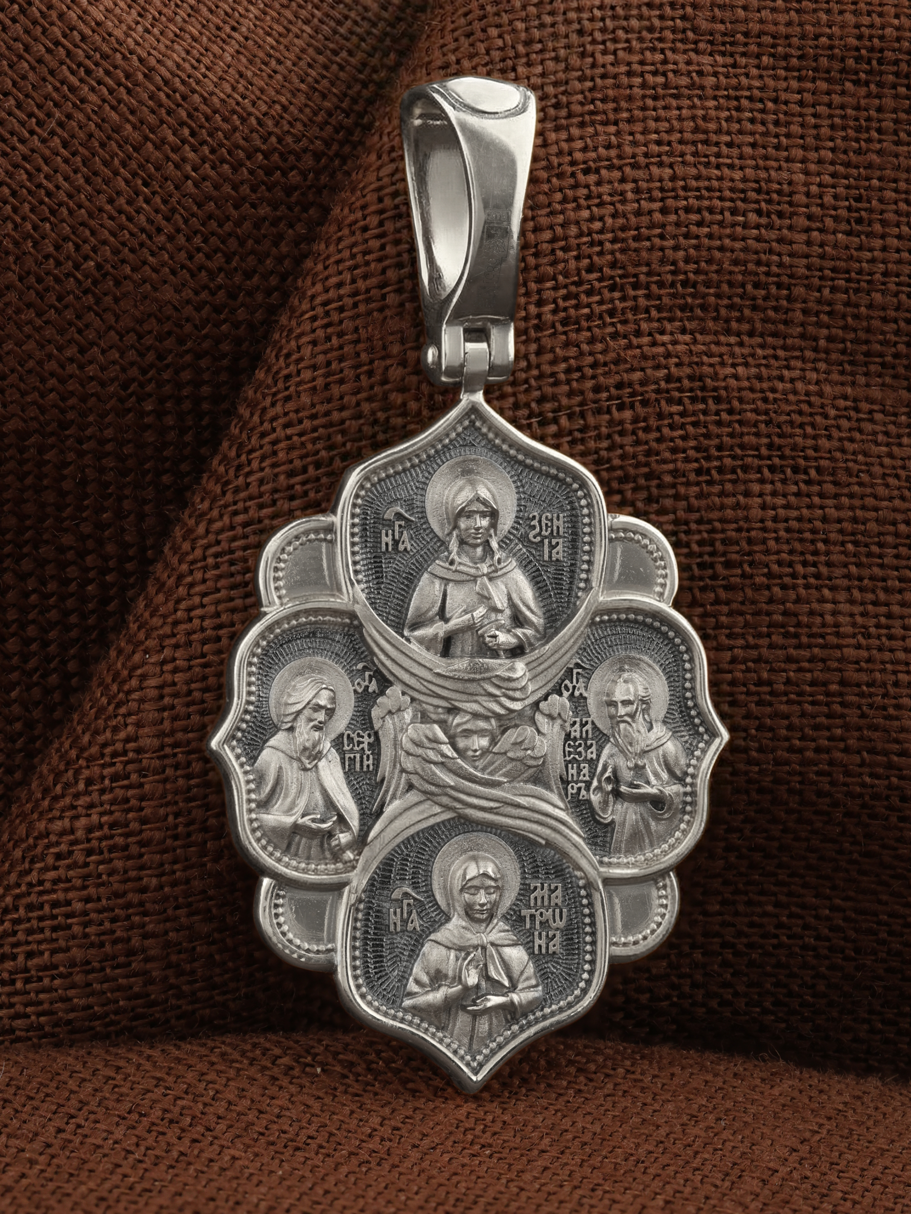 На обороте образка изображены четверо возлюбленных Богом угодников. Слева от Серафима изображен прп. Сергий Радонежский. Этот святой начал свой путь к Богу отшельником в Радонежских лесах, где основал монастырь, ставший духовным центром Руси. Он исцелял больных, которых ему привозили отовсюду, и даже воскресил отрока.