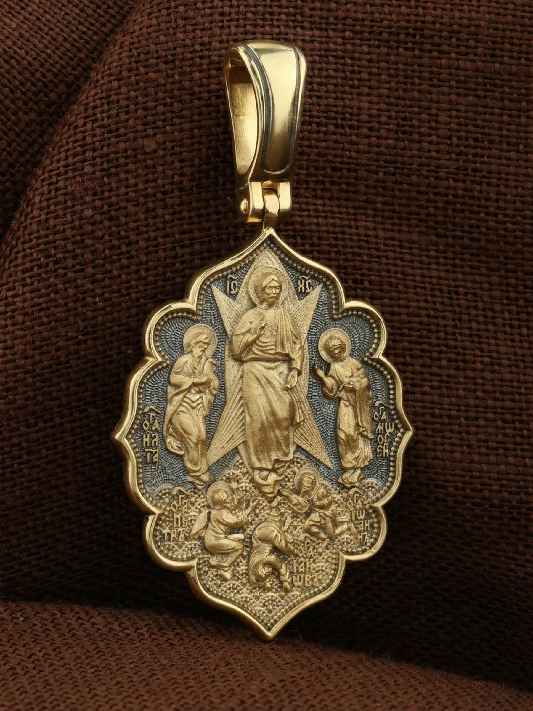 На лицевой стороне образка изображена икона «Преображение». Образ являет Господа Иисуса Христа в тот момент, когда Он предстал трем Своим ученикам: Петру, Иакову и Иоанну Богослову. Пророки Моисей и Илия предстояли рядом и беседовали с Ним. Апостолы едва могли вынести бесконечную радость, которая охватила их в присутствии Бога. Когда же на гору спустилось облако и раздался глас Божий: «Сей есть Сын Мой Возлюбленный; Его слушайте», апостолы в сильном страхе пали на землю (Лк. 9:35). На иконах «Преображение» они так и изображаются — лежащими у ног Христа.