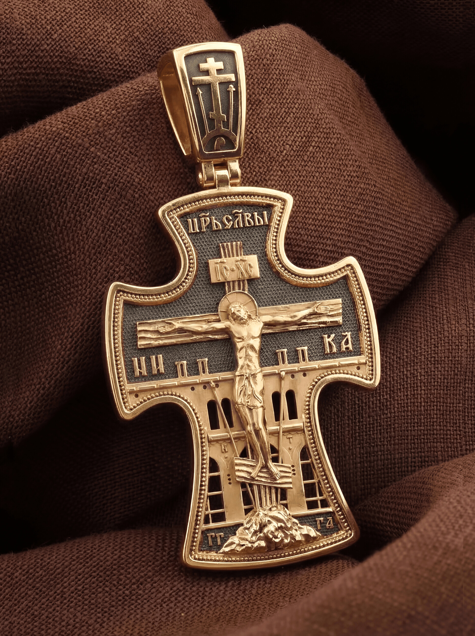 Основное поле лицевой стороны креста занято рельефным изображением Распятия Христова на восьмиконечном Голгофском Кресте. Позади Распятия видна иерусалимская стена, знак того, что Господь был распят вне стен города. Но вместе с тем стена символизирует и Небесный Иерусалим, путь который открылся для человека через Голгофу. У подножья Господа в виде скалистой горки видна сама Голгофа с Главой Адамовой в пещере. По сторонам Голгофы начертаны буквы «ГГ» (Гора Голгофа) и «ГА» (голова Адама). Справа и слева от Креста изображены орудия страданий Господа — трость и копие, обозначенные буквами «Т» и «К». На трости стражники подали Христу пропитанную уксусом губку, когда Он жаждал воды, а копьем пронзили Ему ребра, чтобы проверить: умер ли Он?