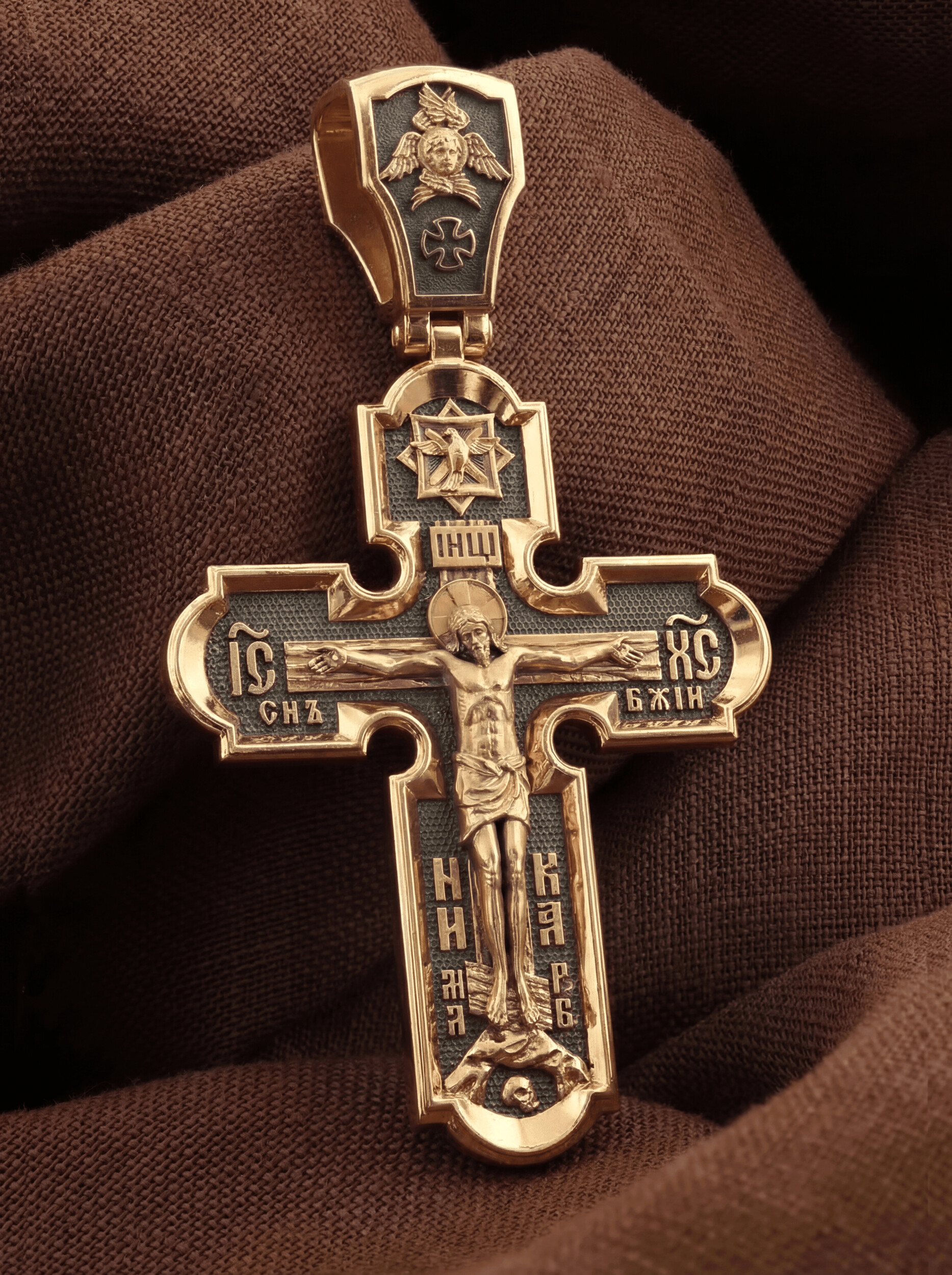 На лицевой стороне креста изображено Распятие Господа и Спасителя нашего Иисуса Христа. Христос, подвергнутый на кресте мучительной казни, своими страданиями искупил нас от древнего греха и даровал нам жизнь вечную. На верхней табличке, выше головы Иисуса, расположена надпись, составленная Понтием Пилатом — «IНЦI». Она означает «Иисус Назорей, Царь Иудейский». Надпись «IС ХС» означает Иисус Христос и словосочетание «СЫН БОЖИЙ», что означает божественную природу Иисуса Христа, помещается на разных сторонах поперечной перекладины креста. В нижней части креста находятся надписи –«НИКА» и «МЛРБ». В переводе с греческого, слово «НИКА» означает «победитель». Именно оно является символом победы Христа над смертью. Надпись «МЛРБ» — «место лобное рай бысть» означает, что место лобное стало раем. Крест стоит на горе камней, символизирующих Голгофу. Под подножием Креста изображена покоящаяся голова (череп) Адама, грехи которого Христос омыл Своею Кровью. Христос в Своей Божественной любви, над которой смерть не властна и которая, страдая, и не страдает в обычном смысле, простирает к людям со Креста Свои объятия, в которые призывается и привлекается весь мир. Поэтому Тело Его не висит, а торжественно покоится на Кресте.