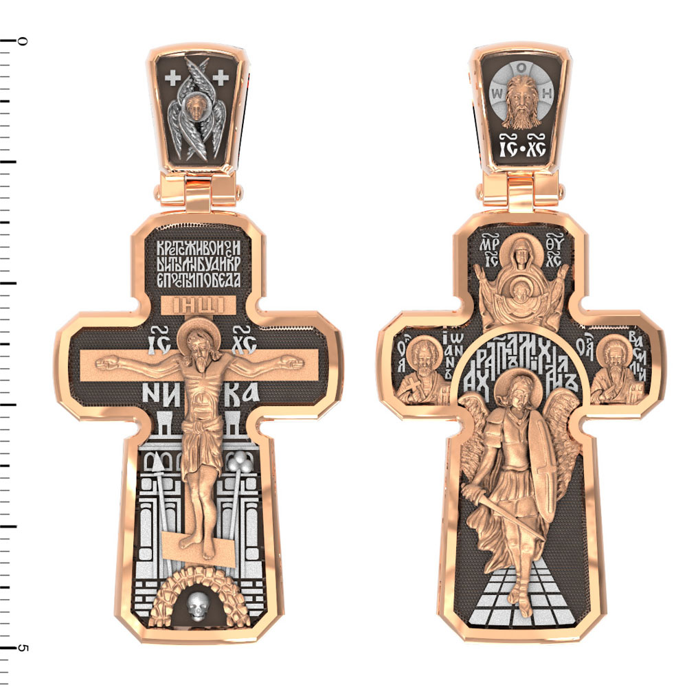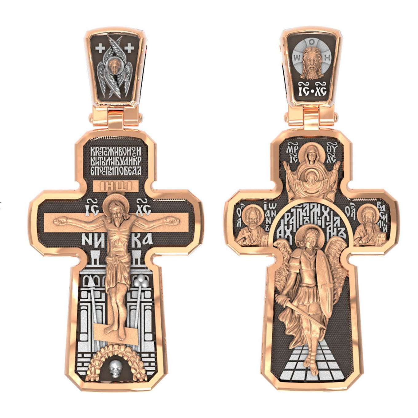 Основное поле лицевой стороны креста занято изображением рельефного Распятия на восьмиконечном Голгофском кресте с копием, тростью по сторонам и Главой Адамовой в пещере на ступенчатой Голгофе. Над крестом написаны слова Канона святому и животворящему Кресту Господню: «Кресте живоносный, ты ми буди крепость, и победа, и щит, и стена нератуема, бесов отгнание, и помыслов погашение, и ума моего сохранение».