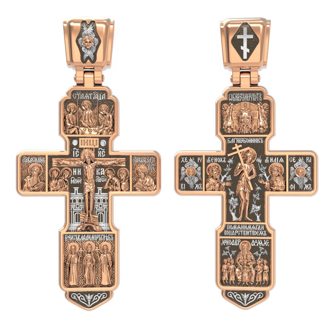 На концах горизонтальной балки креста помещены образы вселенских святителей и творцов литургии Василия Великого и Иоанна Златоуста. В кулонном кольце изображены райские врата с их стражем — Херувимом. Врата, которые открылись благодаря крестной жертве Христа.