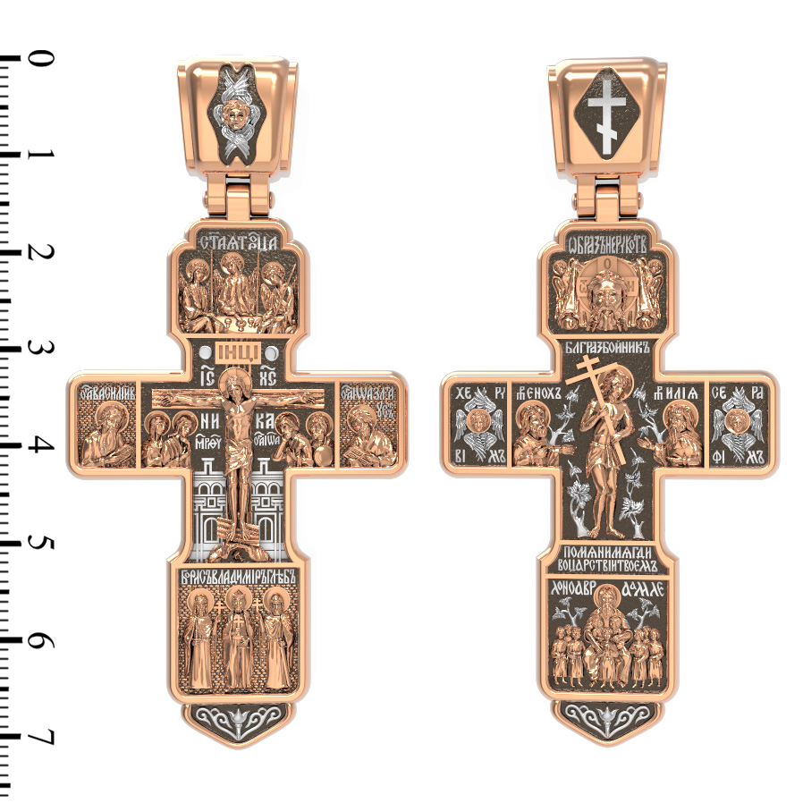 В нижней части креста изображены образы первых русских святых князей-мучеников — Бориса (князь ростовский) и Глеба (князь муромский) и святого равноапостольного князя Владимира. Страстотерпцам Борису и Глебу молятся об умиротворении Отечества, о добром нраве властей и правителей, о сохранении от междоусобицы, о даровании мужества перед лицом смертельной опасности. С Борисом и Глебом неразрывно связан образ их отца — святого равноапостольного князя Владимира, который также почитается как защитник и покровитель Русской Земли и Церкви. В молитвах его называют «отец русский» или «отец всея Руси».