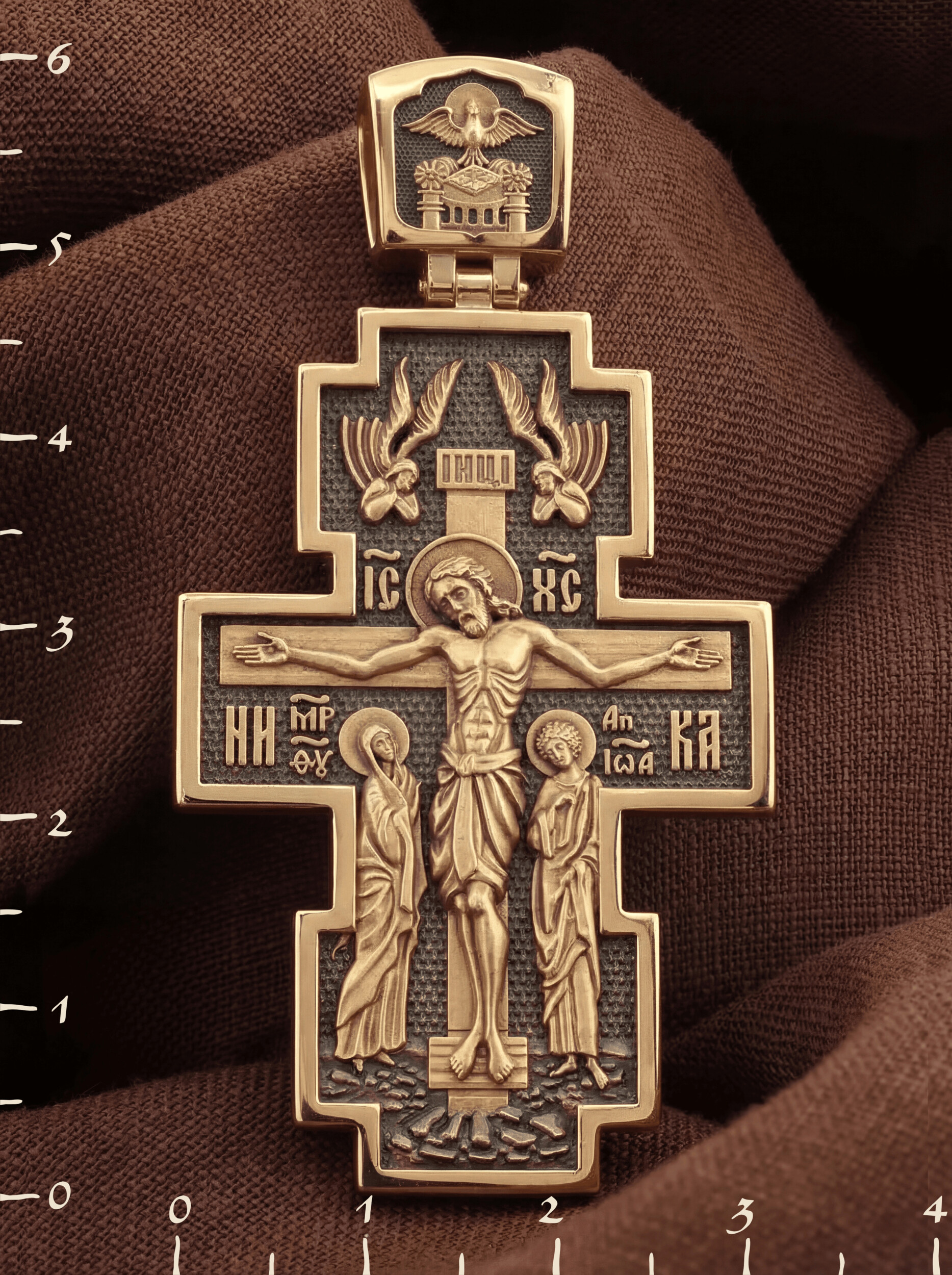 На лицевой стороне креста изображено Распятие Христово — величественный, торжественный образ христианства, знак победы над смертью. Христос, принеся Себя в Жертву на Кресте, искупил грехи всего мира и дал людям возможность обрести спасение. Слева и справа от Креста стоят Богоматерь и апостол Иоанн Богослов. По преданию, именно они до последнего не оставляли Спасителя в Его страданиях, были с Ним до самой смерти. Во главе образка изображен парящий голубь — символ Святого Духа и Его благодати. Сверху над Распятием парят Ангелы. Они изображены летящими с Небес вниз, к Кресту. Ангелы словно поддерживают табличку над головой Спасителя, на которой написано IНЦИ — «Иисус Назарянин Царь Иудейский». Эта табличка — титло — была приколочена римскими палачами как указание на «вину» Христа, то, за что Он был казнен.