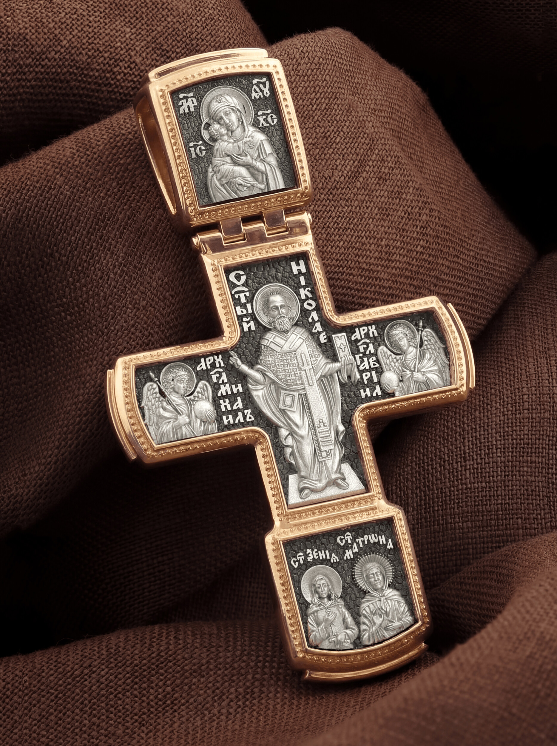 В центре на обороте — самый почитаемый в Православной Церкви святой, Николай Чудотворец, которого еще называют Николай Угодник за то, что он угодил своей жизнью Богу. Ему молятся, отправляясь в путешествие, особенно по морю, просят исцеления в различных недугах, помощи в торговых делах, учебе и поисках достойного супруга. С двух сторон от Николая Чудотворца помещены образы архангелов Михаила и Гавриила. Вверху — Владимирская икона Божией Матери — самая великая русская святыня, многие века бывшая олицетворением нашей земли. Перед ней венчались на царство государи, избирались патриархи. Пречистой Богородице Владимирской клялись в верности Отечеству солдаты и за нее умирали на поле брани. Именно на ее защиту более всего уповала Россия в самые страшные периоды своей истории. В нижнем клейме — иконы двух святых помощниц от всех недугов, блаженных Ксении Петербургской и Матроны Московской.