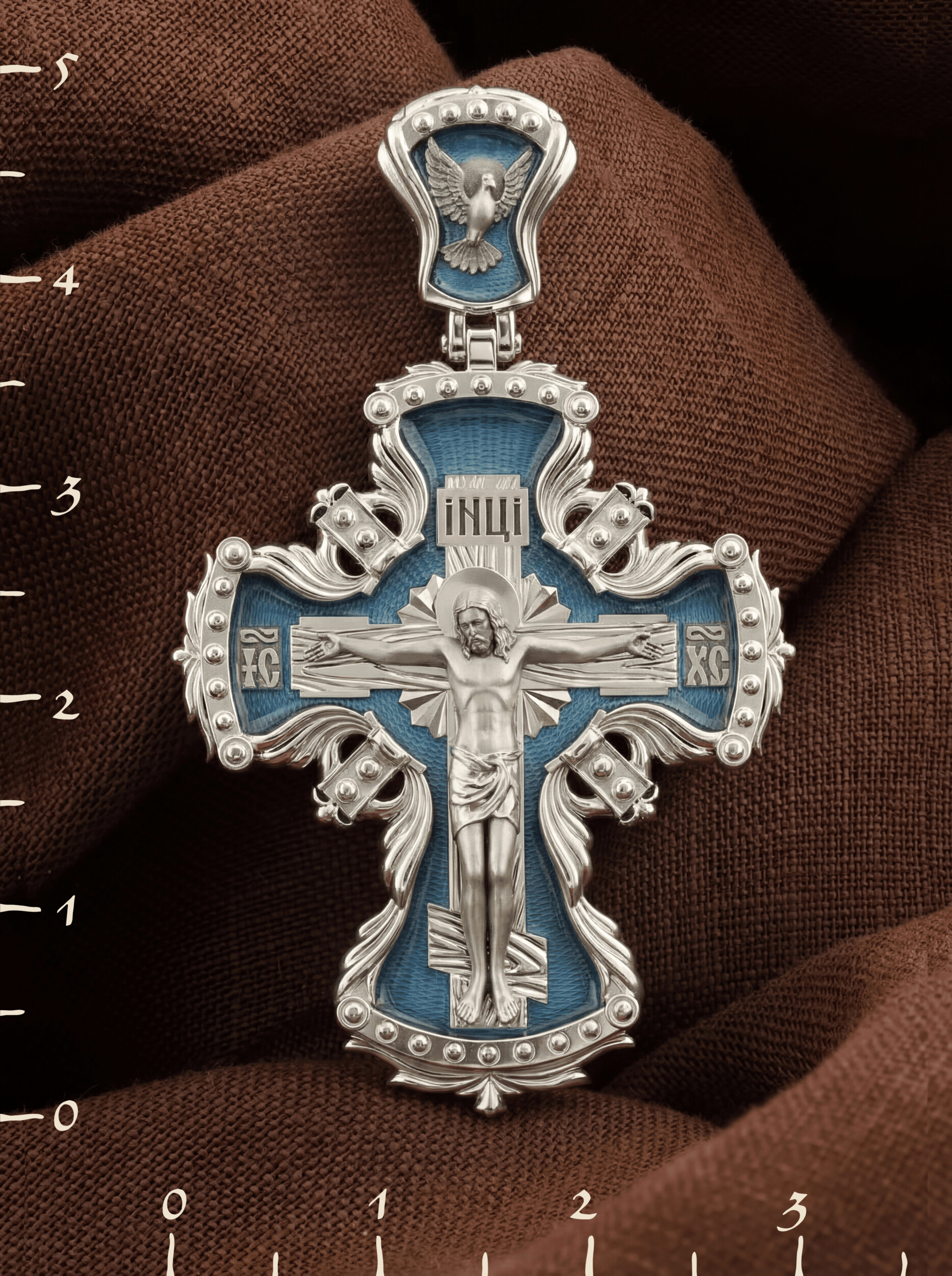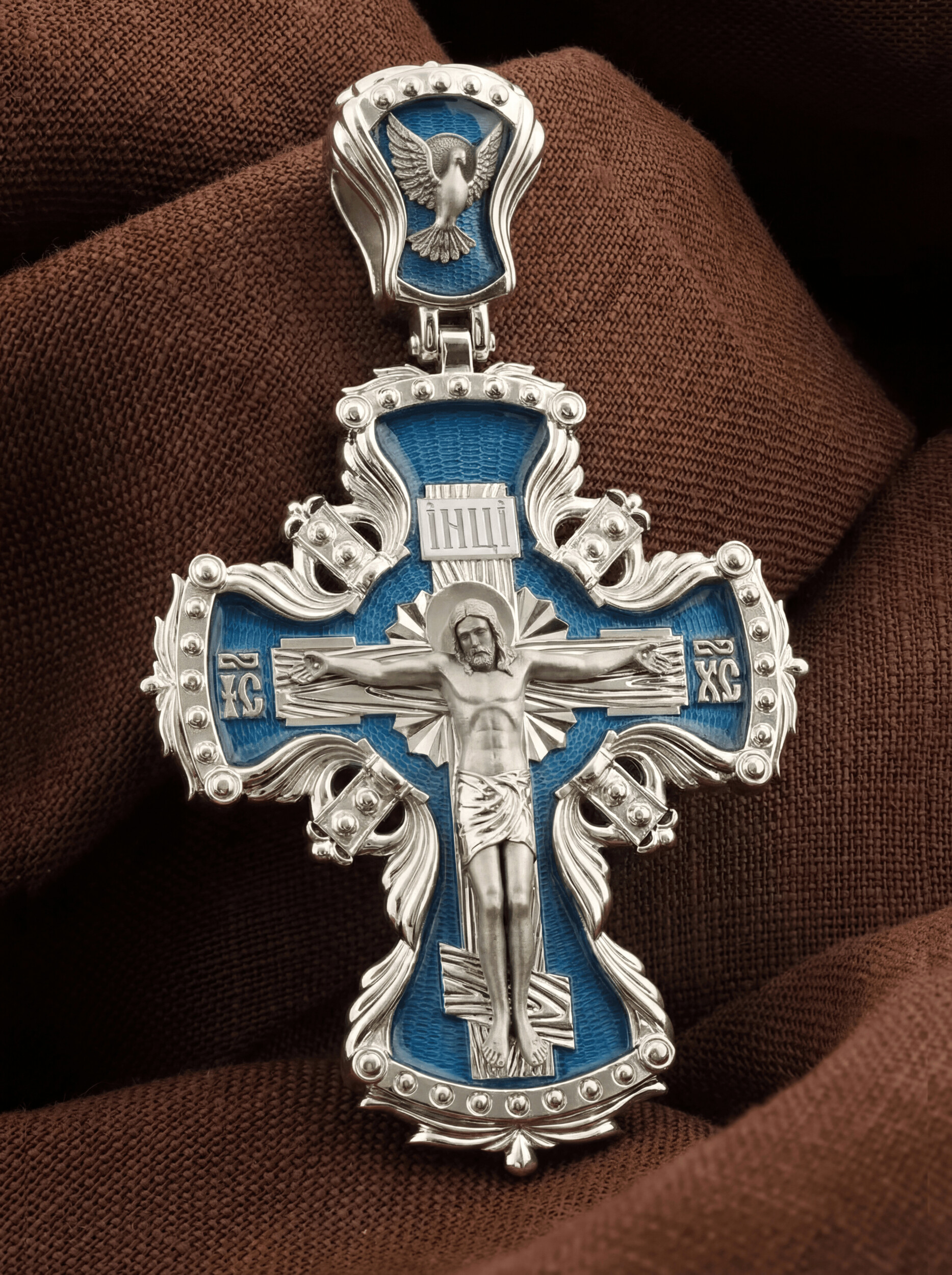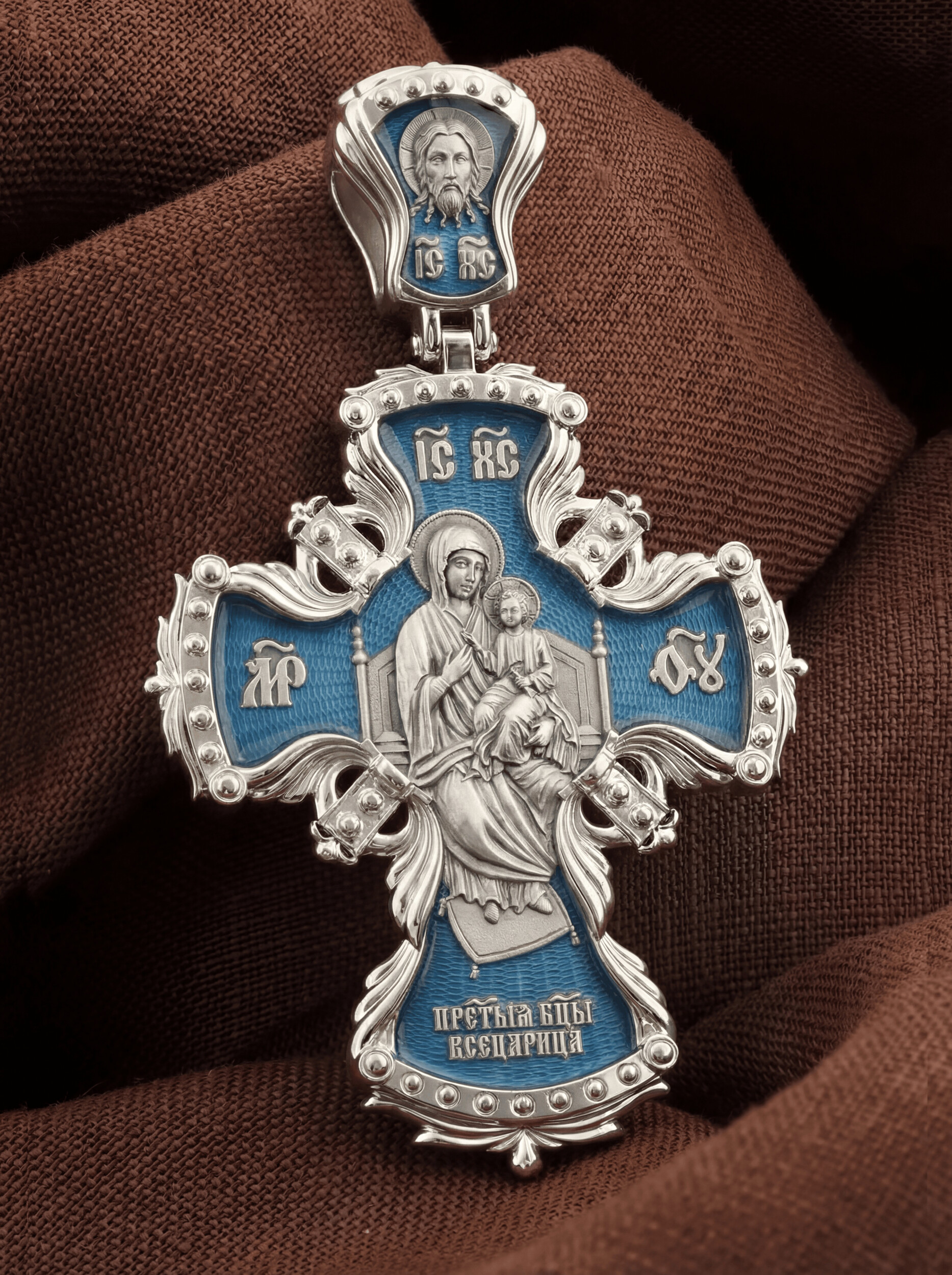 Центральную часть лицевой стороны занимает Распятие Христа — образ жертвы, принесенной Господом за грехи людей. Именно ко Христу, сошедшему на землю ради нашего спасения, возносятся все молитвы. Рядом с Его образом помещены слова — «НИКА» и «СЫН БОЖИЙ». Эти слова характеризуют Господа как Великого Архиерея, победителя смерти. Также Распятие сопровождается надписями, олицетворяющими Христа — это святое имя Христа «IC» (Иисус) «ХС» (Христос). На кулонном кольце изображен голуь — символ Святого Духа.