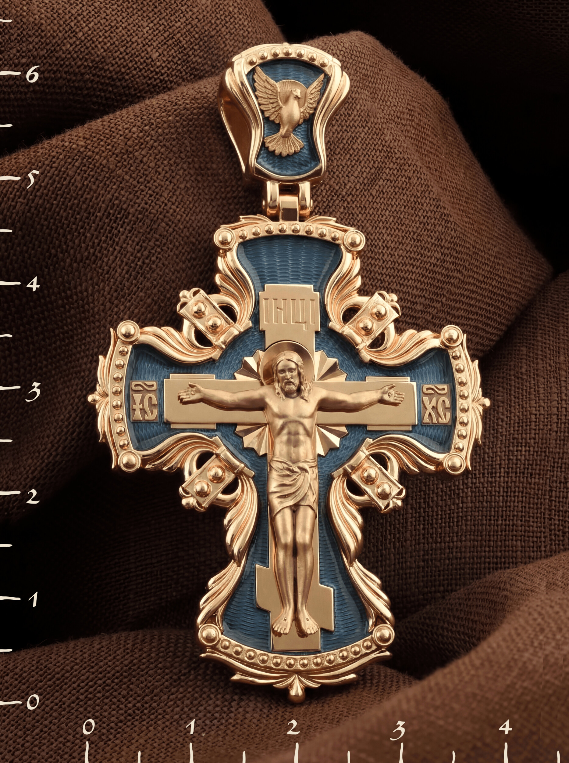 Центральную часть лицевой стороны занимает Распятие Христа — образ жертвы, принесенной Господом за грехи людей. Именно ко Христу, сошедшему на землю ради нашего спасения, возносятся все молитвы. Рядом с Его образом помещены слова — «НИКА» и «СЫН БОЖИЙ». Эти слова характеризуют Господа как Великого Архиерея, победителя смерти. Также Распятие сопровождается надписями, олицетворяющими Христа — это святое имя Христа «IC» (Иисус) «ХС» (Христос). На кулонном кольце изображен голуь — символ Святого Духа.