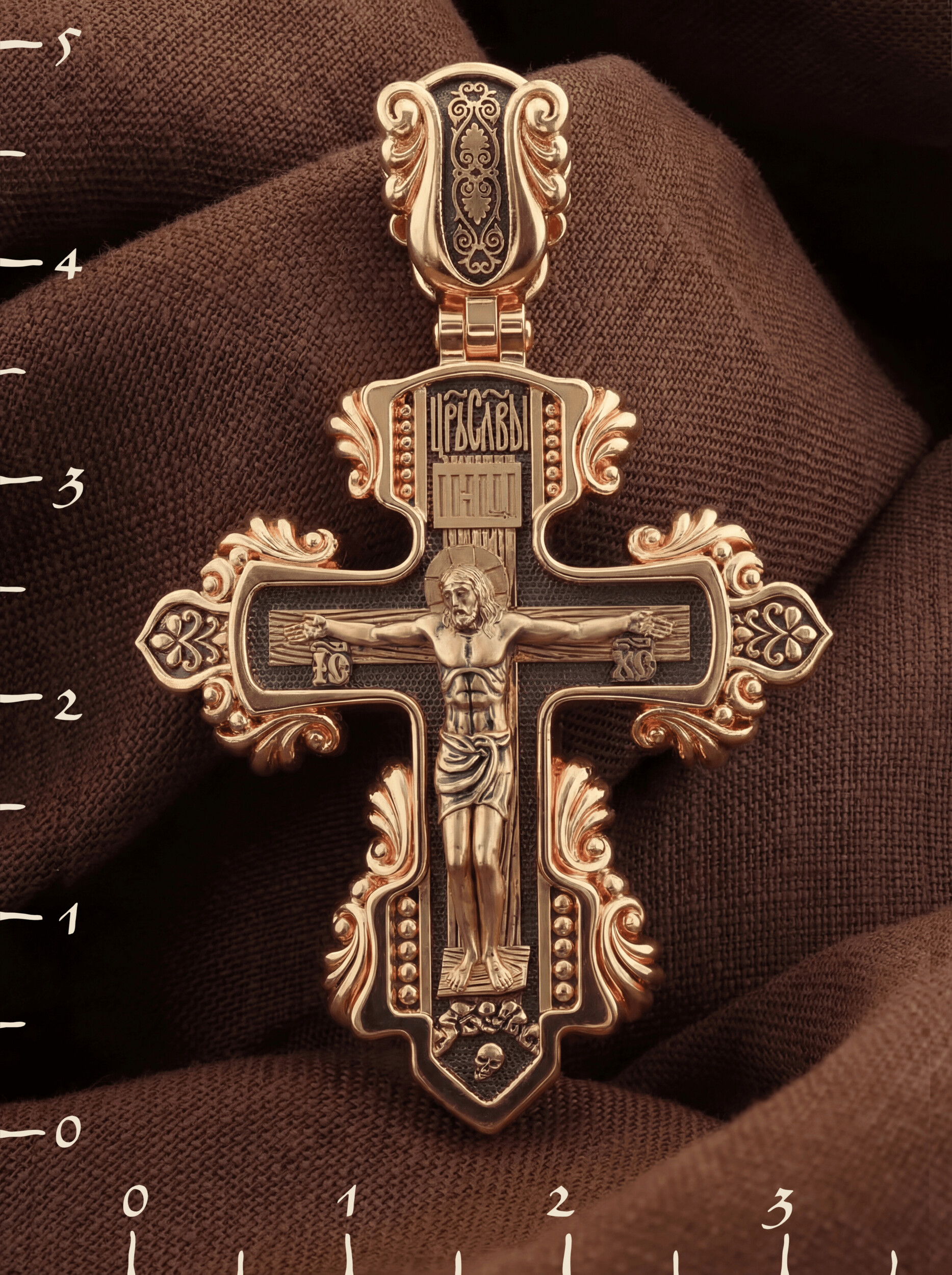 На лицевой стороне креста изображено Распятие Господа и Спасителя нашего Иисуса Христа, отдавшего Себя на смерть, для искупления грехов мира. Крест является символом жертвенной любви всеблагого Бога к падшим людям, всепобеждающим духовным оружием христиан, основанием и средоточием церковной жизни. На верхней табличке, выше головы Иисуса, расположена надпись, составленная Понтием Пилатом — «ИНЦИ». Она означает «Иисус Назорей, Царь Иудейский». Надпись «IС ХС» означает Иисус Христос помещается на разных сторонах поперечной перекладины креста. Крест стоит на горе камней, символизирующих Голгофу. В ее основании различается череп — это голова Адама. Над Распятием надпись — Царь Славы.