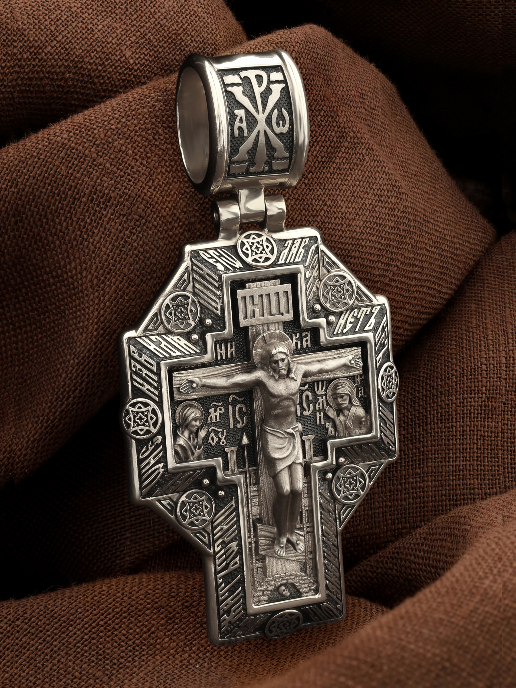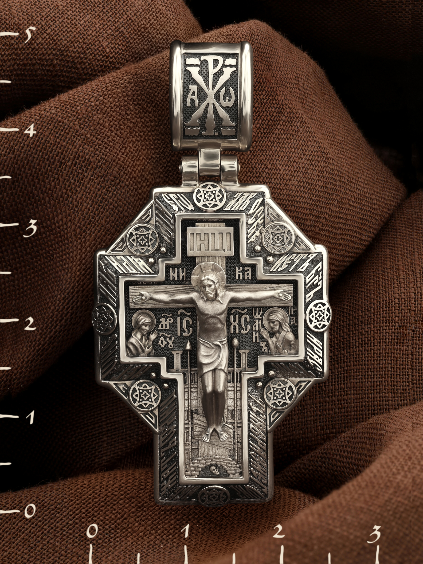 На лицевой стороне креста изображено Распятие Господа и Спасителя нашего Иисуса Христа. Крест- символ спасения и искупления рода человеческого, знамение победы над смертью и адом. Иисус Христос, как искупительная жертва освобождения человечества от власти греха, умер крестной смертью и в третий день воскрес. На верхней табличке, выше головы Иисуса, расположена надпись, составленная Понтием Пилатом — «ИНЦИ». Она означает «Иисус Назорей, Царь Иудейский». Над перекладиной написано слово «НИКА» (греч. — Победитель). Ниже перекладины написано сокращенно имя Спасителя «IC XC» — Иисус Христос. Крест стоит на горе камней, символизирующих Голгофу. В ее основании различается череп — это голова Адама. Справа от Распятия помещен лик Пречистой Богородицы. Слева изображен Пророк Предтеча и Креститель Господень Иоанн. Лицевая сторона креста обрамлена словами псалма: «Да воскреснет Бог, и расточатся врази Его, и да бежат от лица Его ненавидящии Его».