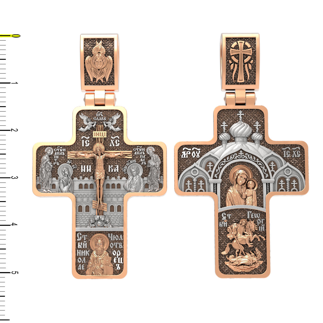 На центральной части оборотной стороны креста изображена Казанская икона Божией Матери в киоте. Она является одной из главных православных святынь на Руси. Ниже помещен образ Святого Великомученика Георгия Победоносца — одного из самых почитаемых и удивительных святых. На образке он изображен как воитель поражающий копьем огнедышащего змея. Змей символизирует собою сатанинские силы. На кулонном кольце помещен крест.