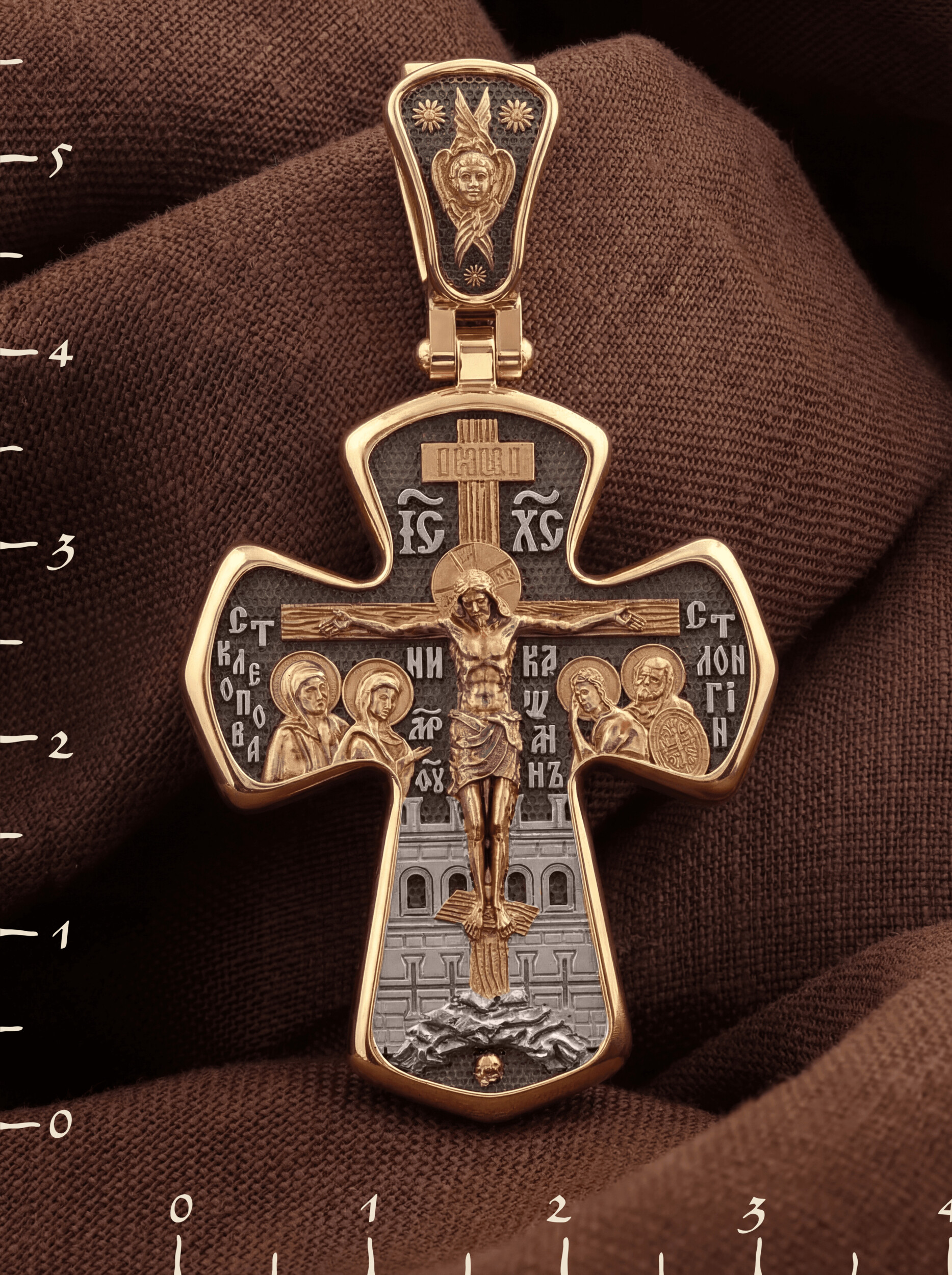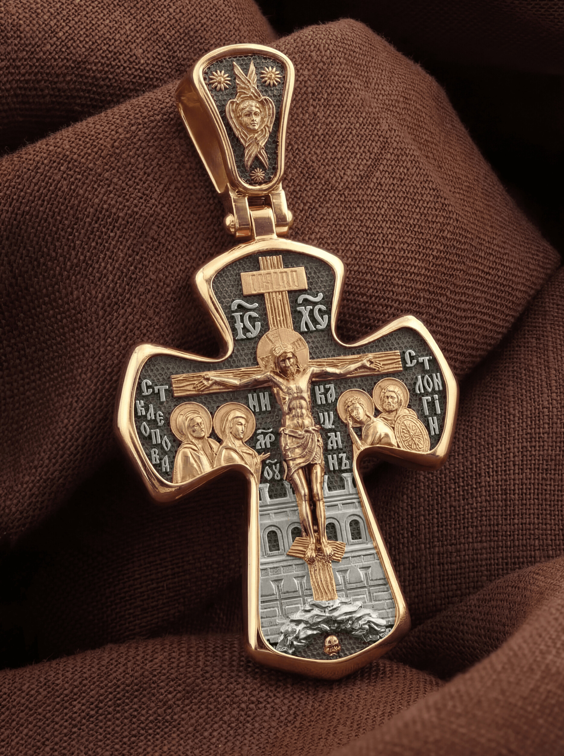 На лицевой стороне креста изображено Распятие Господа и Спасителя нашего Иисуса Христа, отдавшего Себя на смерть, для искупления грехов мира. Господь сказал: кто хочет идти за Мною, отвергнись себя, и возьми крест свой, и следуй за Мною. (Мк. 8: 34). Крест является символом жертвенной любви всеблагого Бога к падшим людям, всепобеждающим духовным оружием христиан, основанием и средоточием церковной жизни. На верхней перекладине помещена надпись «IС» « ХС», что означает Иисус Христос. Ниже — слово «НИКА», что означает «победитель». Слева от Распятия изображена Пресвятая Богородица, справа — апостол и евангелист Иоанн Богослов, один из ближайших учеников Иисуса Христа. За Распятием высится Иерусалимская стена, в знак того, что Господь был распят вне стен города. Возвышение, на котором стоит Крест, символизирует гору Голгофу, на которой произошло Распятие. Под подножием Креста изображена покоящаяся голова (череп) Адама. На кулонном кольце помещен крест