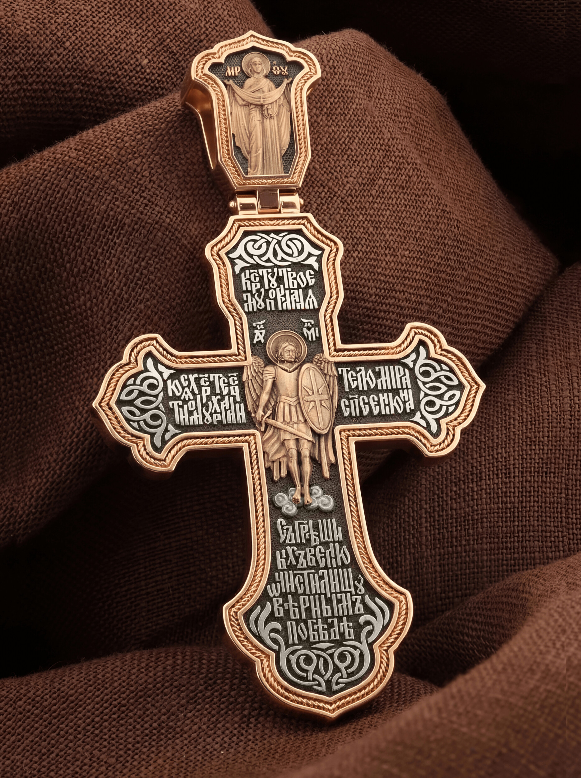 В центре оборотной стороне креста помещен образ Архангела Михаила — верного служителя Божия, который низринул с Неба возгордившегося денницу с другими павшими духами. Он изображен в воинственном виде с огненным мечом в правой руке и щитом в левой. В Православии его называют Архистратигом, что означает глава святого воинства Ангелов и Архангелов. Вокруг образа размещена молитва: «Кресту твоему поклоняемся, Христе, честному хранителю мира, спасения нас грешных, велию очистилищу, верным победе». На кулонной кольце изображена икона Божией Матери «Покров Пресвятой Богородицы». Праздник Покрова Пресвятой Богородицы пришел на Русь в XII веке из Византии и стал одним из самых почитаемых. Богородица простирает Свой молитвенный покров над всеми православными христианами и умоляет Сына своего о даровании вечного спасения каждому человеку.