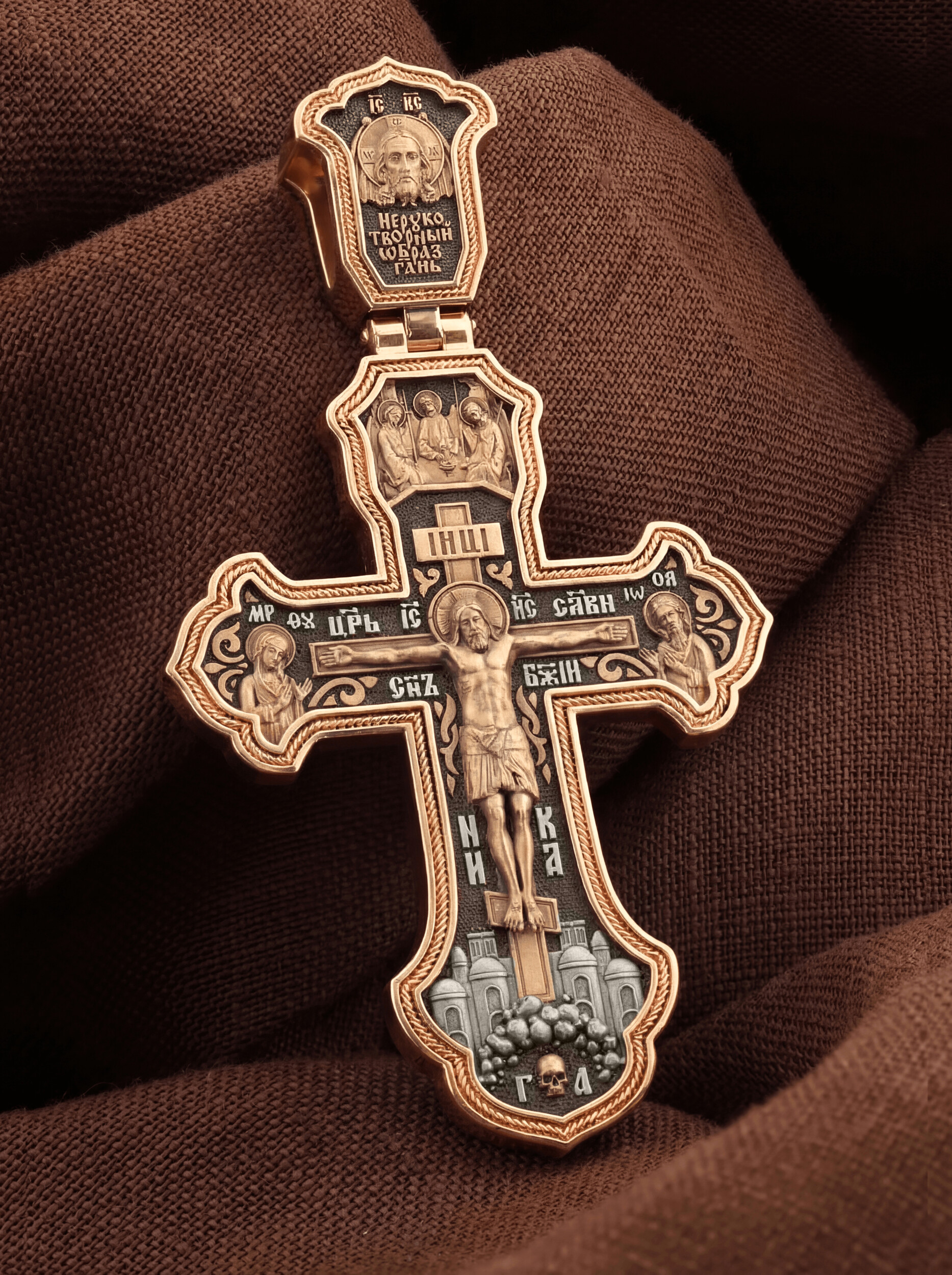 На лицевой стороне креста изображено Распятие Господа и Спасителя нашего Иисуса Христа, отдавшего Себя на смерть, для искупления грехов мира. Крест является символом жертвенной любви Всеблагого Бога к падшим людям, всепобеждающим духовным оружием христиан, основанием и средоточием церковной жизни. Господь сказал: кто хочет идти за Мною, отвергнись себя, и возьми крест свой, и следуй за Мною. (Мк. 8: 34). Над распятием помещена икона Святой Троицы, написанная преподобным Андреем Рублёвым в XV веке. На иконе изображены три ангела, являющихся образом Единосущного и Триипостасного Бога — Святой Троицы. На кулонном кольце изображен Нерукотворный образ Господа и Спасителя нашего Иисуса Христа. На верхней табличке, выше головы Иисуса, расположена надпись, составленная Понтием Пилатом — «IНЦI». Она означает «Иисус Назорей, Царь Иудейский». Надпись «IC» «ХC», означает Иисус Христос, помещается на разных сторонах поперечной перекладины креста. Рядом — слово «НИКА», что означает «победитель» и надпись «Царь Славы». Слева от Распятия изображена Пресвятая Богородица, справа — Про-рок Предтеча и Креститель Господень Иоанн. Ниже расположена надпись «Сын Божий». За крестом высится Иерусалимская стена, в знак того, что Господь был распят вне стен города. Крест стоит на горе камней, символизирующих Голгофу. В ее основании различается череп– это голова Адама.