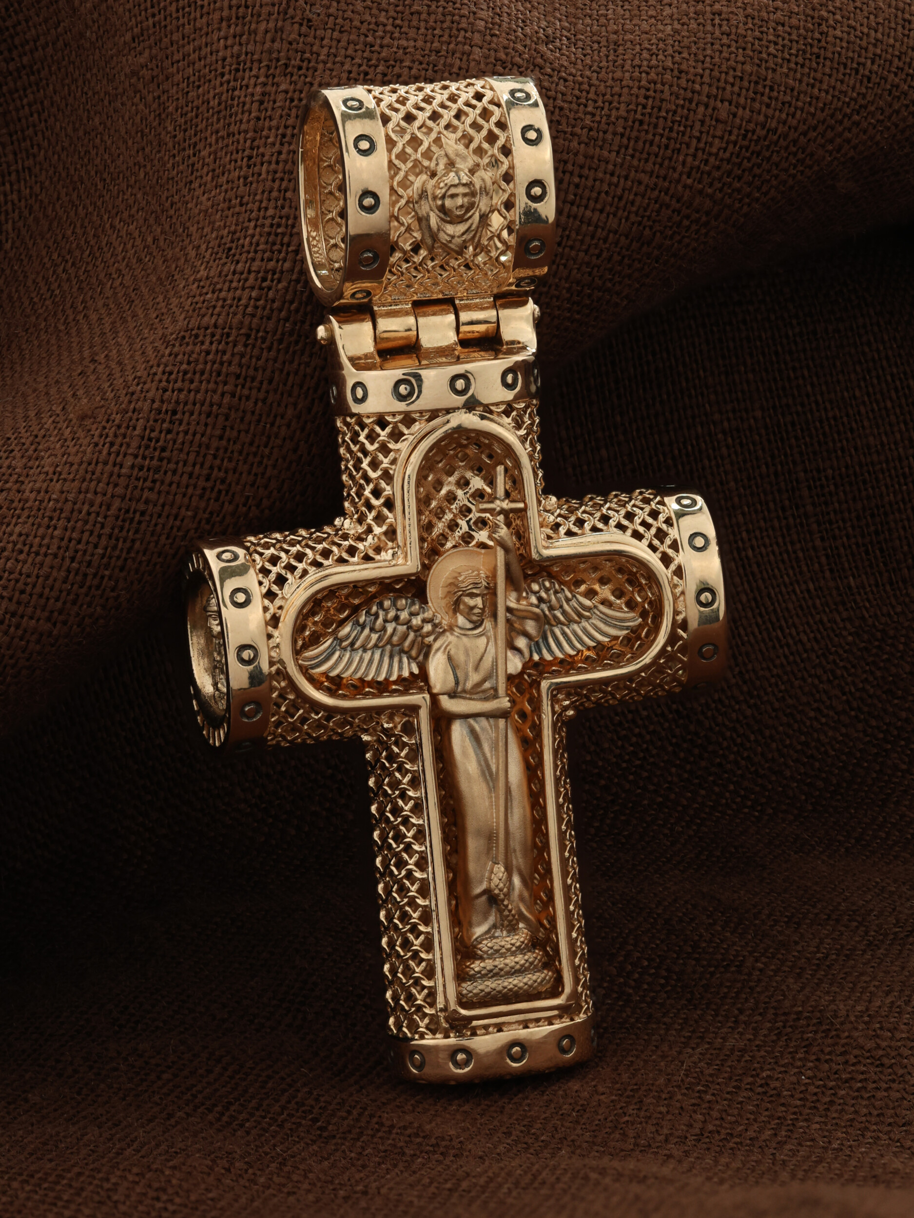 На лицевой стороне креста изображено Распятие Господа и Спасителя нашего Иисуса Христа. Крест- символ спасения и искупления рода человеческого, знамение победы над смертью и адом. Иисус Христос, как искупительная жертва освобождения человечества от власти греха, умер крестной смертью и в третий день воскрес. Распятие сопровождается каноническими надписями. На верхней табличке, выше головы Иисуса, расположена надпись, составленная Понтием Пилатом — «IНЦI». Она означает «Иисус Назорей, Царь Иудейский». Надписи «IC» «ХC», означает Иисус Христос, «НИКА», что означает Победитель, «Царь Славы» и «Сын Божий», размещается на разных сторонах поперечной перекладины креста. Крест стоит на горе камней, символизирующих Голгофу, которая обозначена надписью «Г Г». В ее основании различается череп — это голова Адама, обозначенный надписью «Г А». Надпись «МЛРБ» — «место лобное рай бысть» означает место лобное стало раем. Вдоль креста изображены орудия Страстей Христовых: копие сотника Лонгина, которым пронзили подреберье мёртвого Иисуса, чтобы убедиться в Его смерти, и трость с губкой, с которой Иисуса напоили уксусом. Они обозначены буквами «К» и «Т». На кулонном кольце размещен «Нерукотворный образ Иисуса Христа», на оборотной стороне кулонного кольца- шестикрылый Серафим.