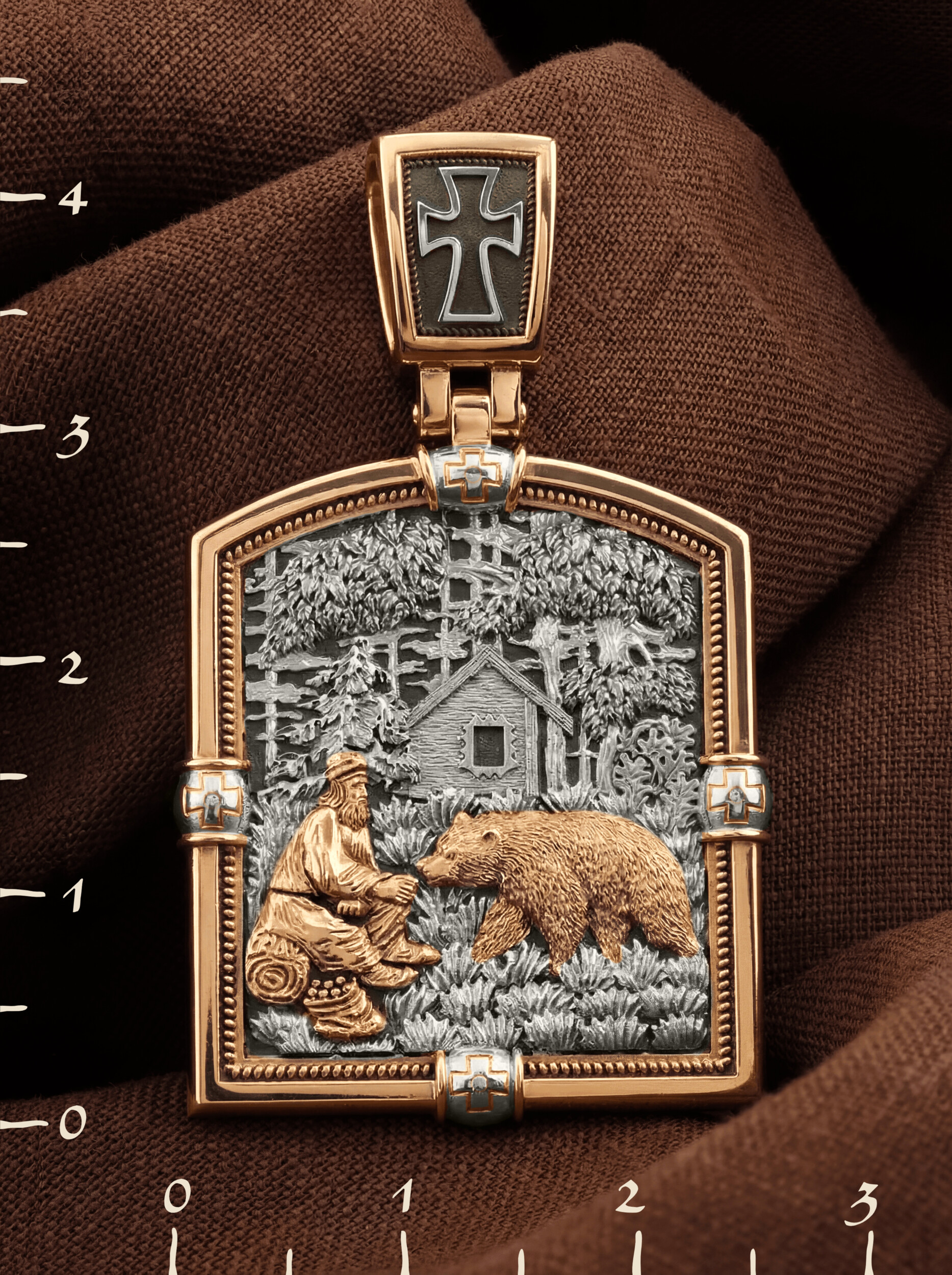 На образке изображен один из самых узнаваемых моментов жития преподобного: Тысячу дней и тысячу ночей Серафим провел в подвиге столпничества на каменном валуне. Узнав о строгой жизни преподобного отца Серафима, многие приходили к нему за советом и наставлениями. Умея узнавать и различать людей, старец от некоторых уклонялся, сохраняя молчание. Но тех, кто имел до него действительную духовную нужду, он охотно принимал и с любовью руководил их своими советами, наставлениями и духовными беседами. Даже диким зверям преподобный Серафим внушал благоговение: многие, посещавшие его в дальней пустыне, видели около него громадного медведя, которого он кормил из рук.