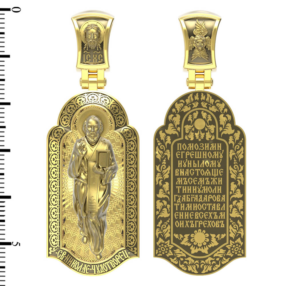 На лицевой стороне образка изображен Святитель Николай архиепископ Мир Ликийских, Чудотворец. Он является одним из самых почитаемых святых в православном мире. Избранник Божий Николай стал вершиной всех добродетелей. С кем из величайших праведников не сравнялся он образом духовной красоты, кому из них не последовал в своих деяниях и чудотворениях? Всеблаженный Николай был кроток, как Моисей, мужественен, как Давид, славен простотой нрава, как Иаков. Словно Ной, он спасал стадо Господне в новом ковчеге от потопа ересей. Вся жизнь святого Николая — это служение Богу. Много великих чудес сотворил на земле и на море великий Святитель Николай Угодник. Он укрощал штормы, спасал от потопления и выносил на сушу из глубины морской, освобождал из плена и приносил освобожденных домой, избавлял от уз и темницы, освобождал от смерти и подавал многим различные исцеления: слепым — прозрение, хромым — хождение, глухим — слух.