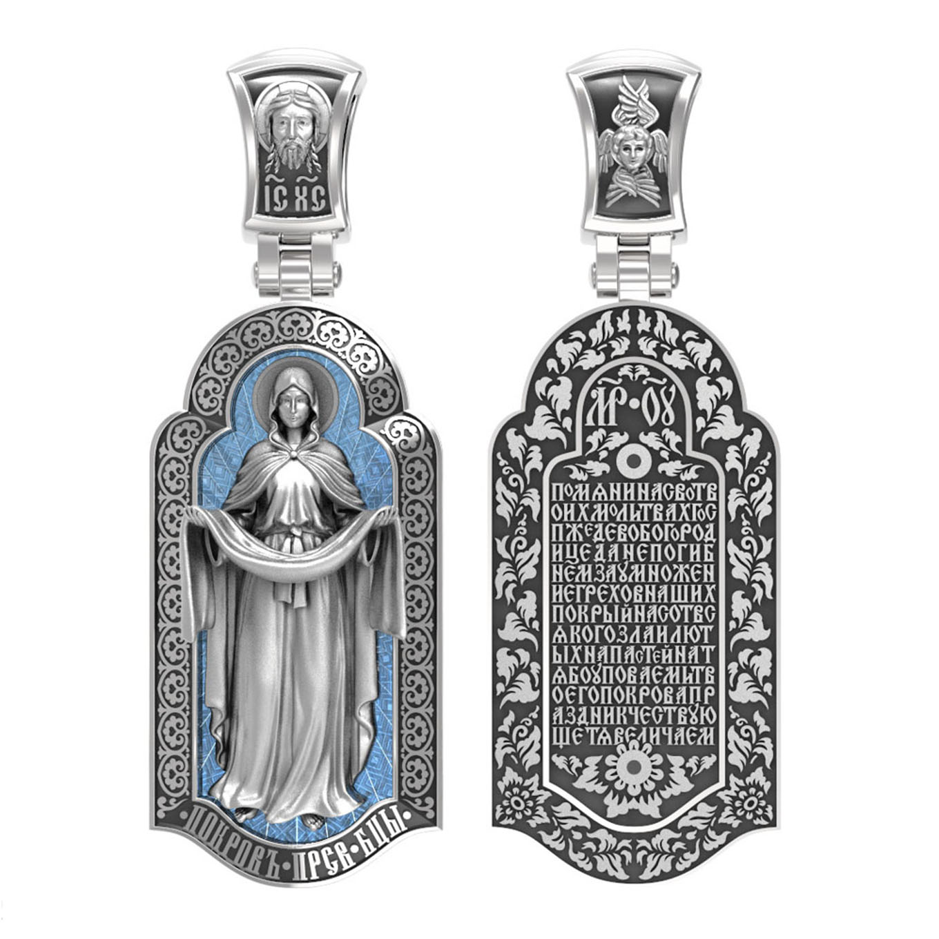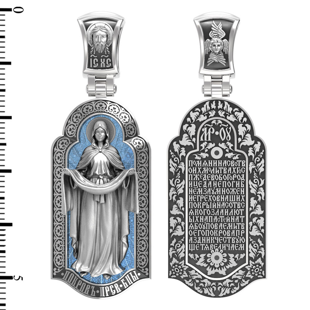 На лицевой части образка изображена икона Покров Пресвятой Богородицы. Праздник Покрова Божией Матери является воспоминанием чуда, которое произошло во Влахнернской церкви 1 (14) октября 910 года: Пресвятая Богородица явилась верующим над алтарем храма и распростерла над ними Свое покрывало. В этот день Божья Матерь открыла людям, что Она является Ходатаицей за них перед Богом. Богородица простирает Свой молитвенный покров над всеми православными христианами и умоляет Сына Своего о даровании вечного спасения каждому человеку.