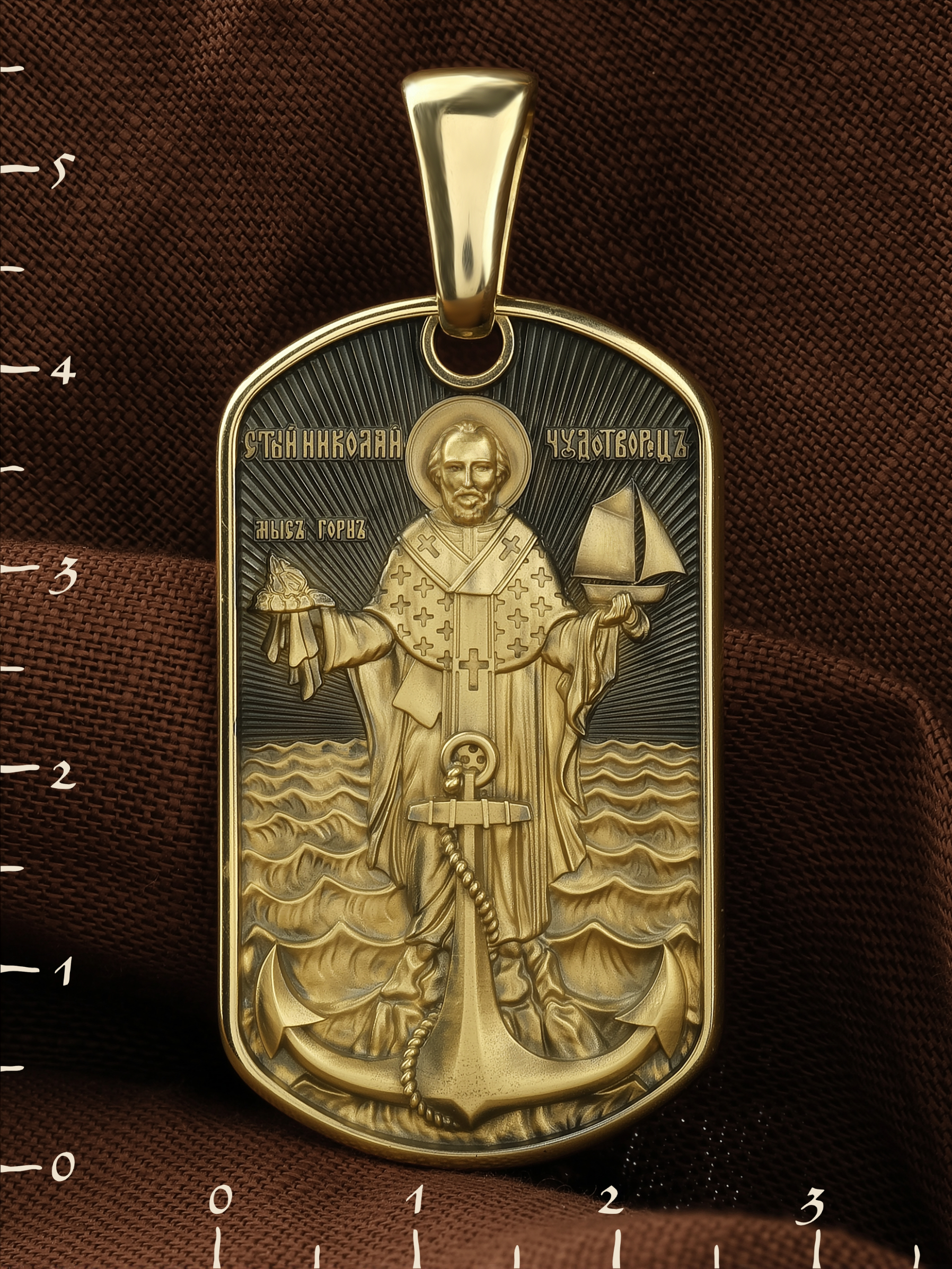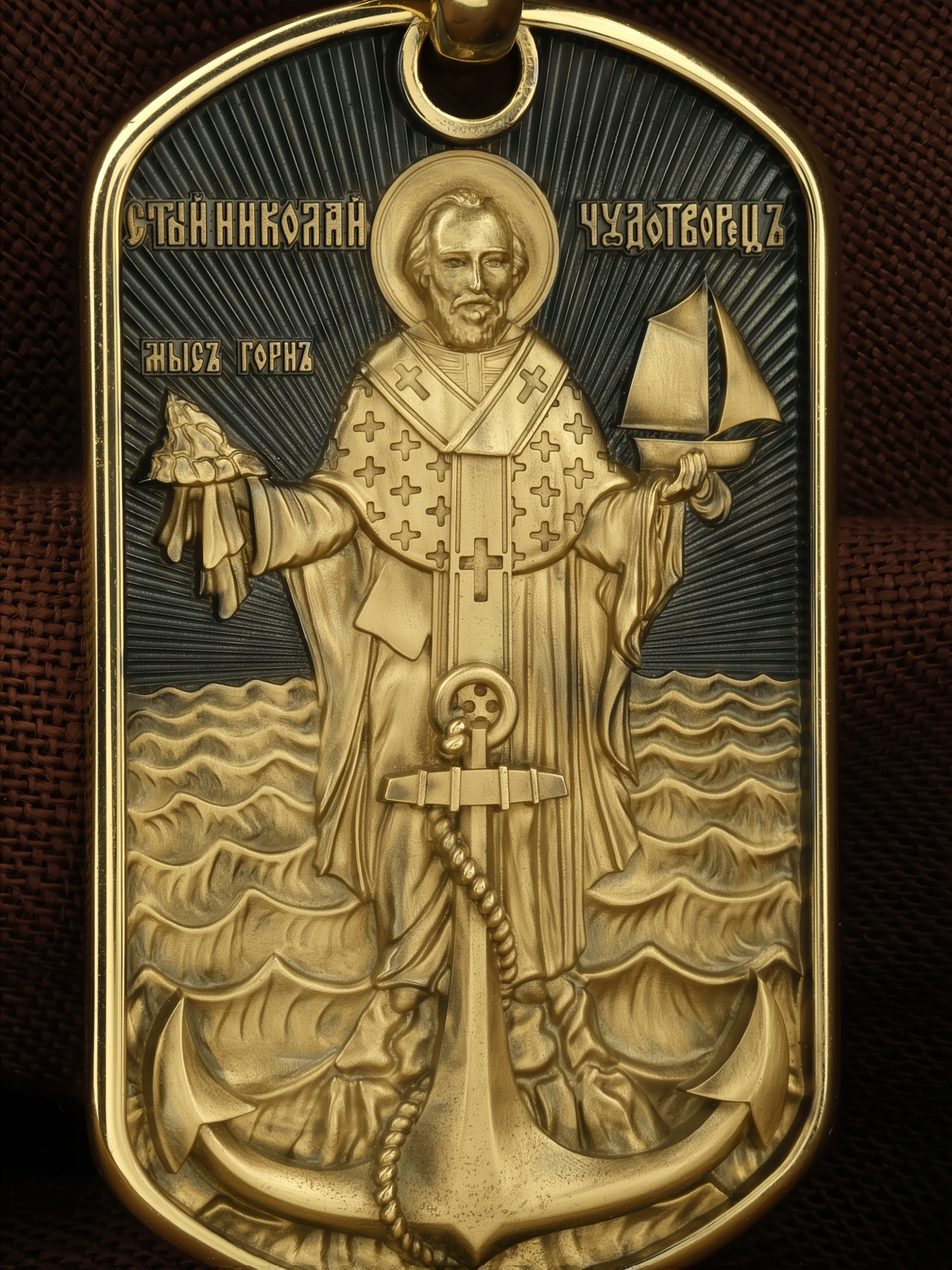 Лицевую сторону возглавляет икона Святителя Николая Чудотворца. Живший в III веке епископ Ликийского города Миры — самый почитаемый святой не только в России, но и во всем мире. Николай Чудотворец, помощник в делах, покровитель учащихся, утешитель обиженных и нуждающихся, целитель самых страшных и тяжелых недугов, предстатель и молитвенник за людей перед Богом. Также Святитель Николай Чудотворец известен своими молитвами за путешественников, когда непрестанный ветер и бушующие волны утихают и корабль заходит в спокойную гавань.