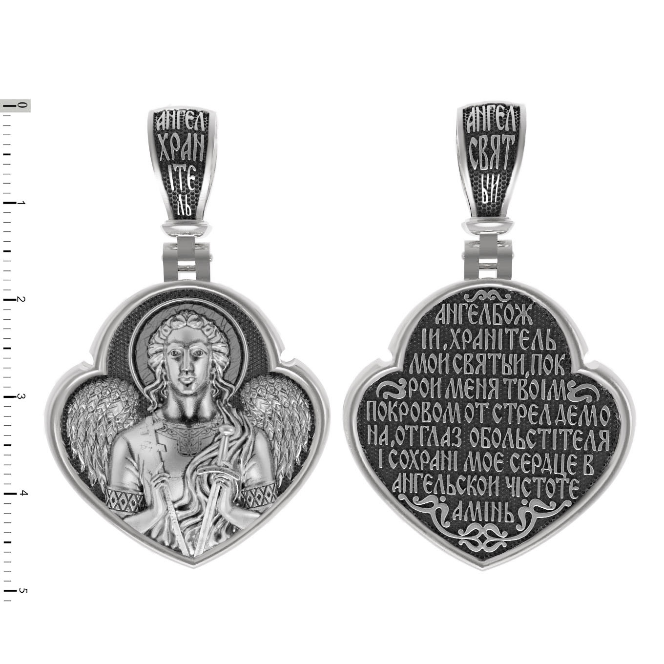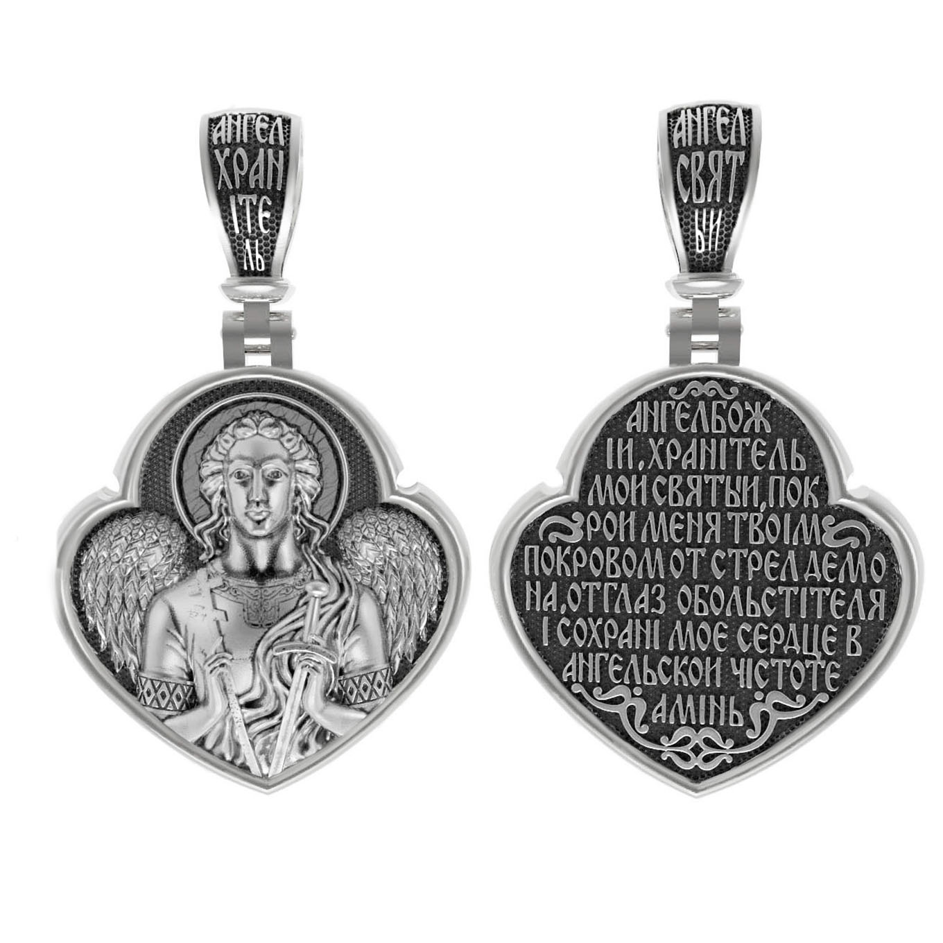 На лицевой стороне образка изображен Святой Ангел-Хранитель в виде прекрасного, светозарного юноши держащего в правой руке крест, а в левой — мечь. А? нгел-Хранитель — это Ангел приставляемый Богом к человеку при крещении для охраны и помощи в добрых делах. Он невидимо находится при человеке на протяжении всей его жизни, если человек сохраняет в себе любовь к Богу и истинную веру перед Ним. Ангел-Xранитель делают для нас все, что служит к истинному нашему благу и спасению. Невидимо пребывая при нас постоянно, он, руководствуя нас ко спасению, не только по нашему желанию таинственно наставляет нас на все доброе и полезное, не только возносит наши молитвы к Богу, но еще и сам от себя охраняют и защищают нас от врагов видимых и невидимых и ходатайствует за нас пред Богом.