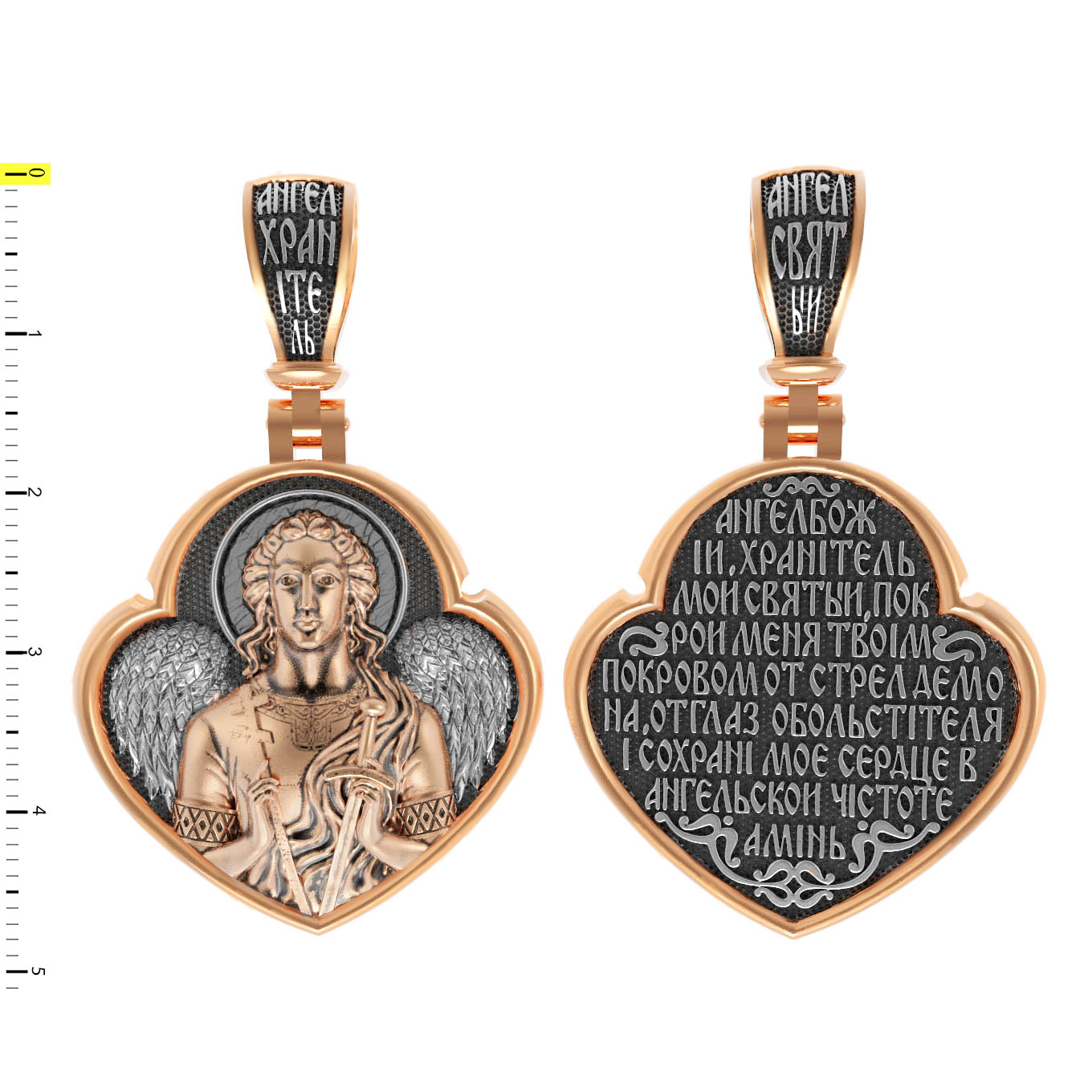 На оборотной стороне образка написана молитва: «Ангеле Божий, Хранитель мой Святый, покрой меня твоим покровом от стрел демона, от глаз обольстителя и сохрани мое сердце в ангельской чистоте. Аминь».