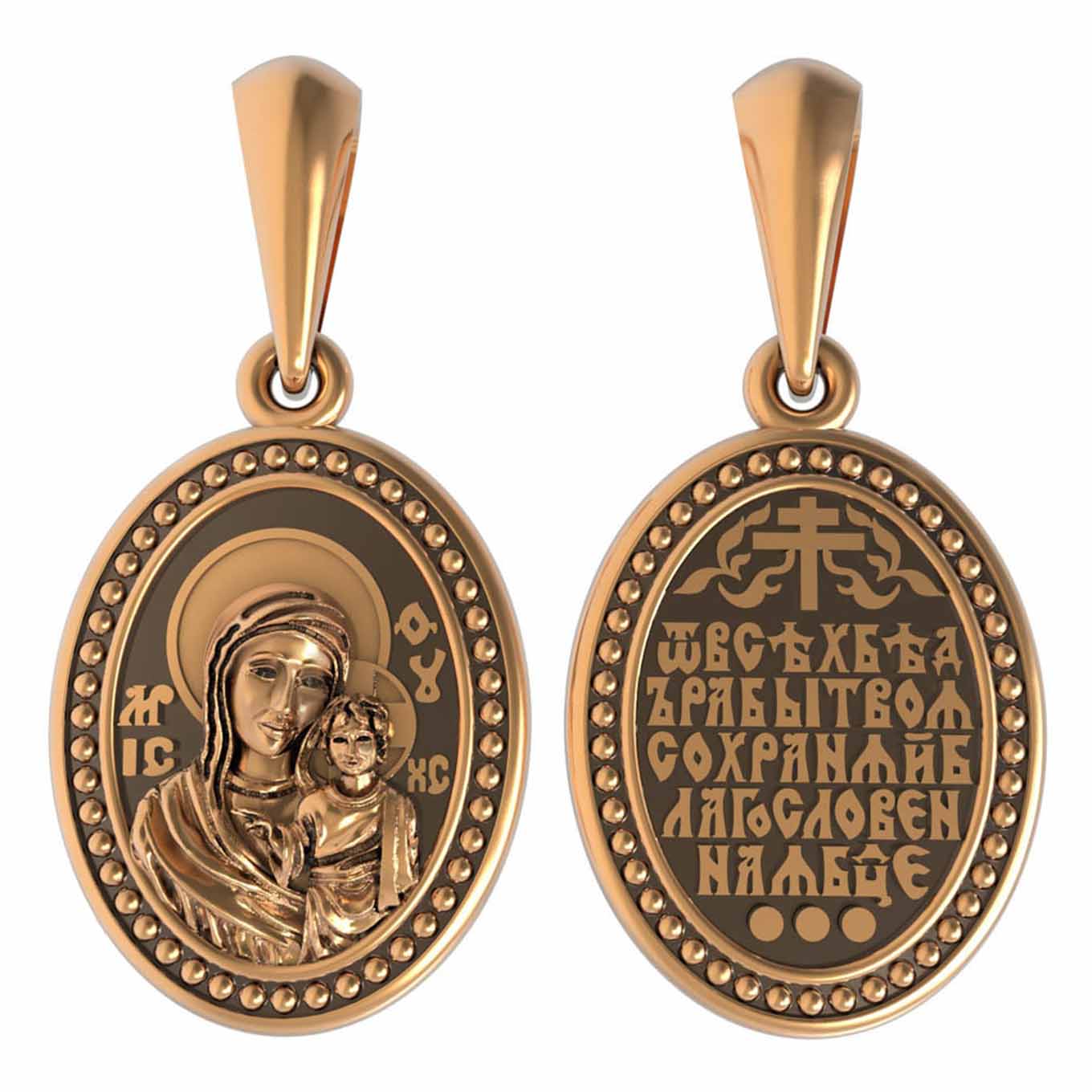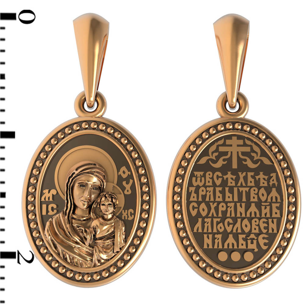 На лицевой части образка изображена Казанская икона Пресвятой Богородицы — одна из самых почитаемых в России. Икона была явлена на пожарище в Казани в 1579 году. В 1904 году святыня была похищена и уничтожена, но чудотворную силу иконы Богородица явила во многих ее списках. Молитва перед Казанской иконой Божьей Матери помогает во всех сложных случаях жизни, во всех печалях, невзгодах, скорбях.
