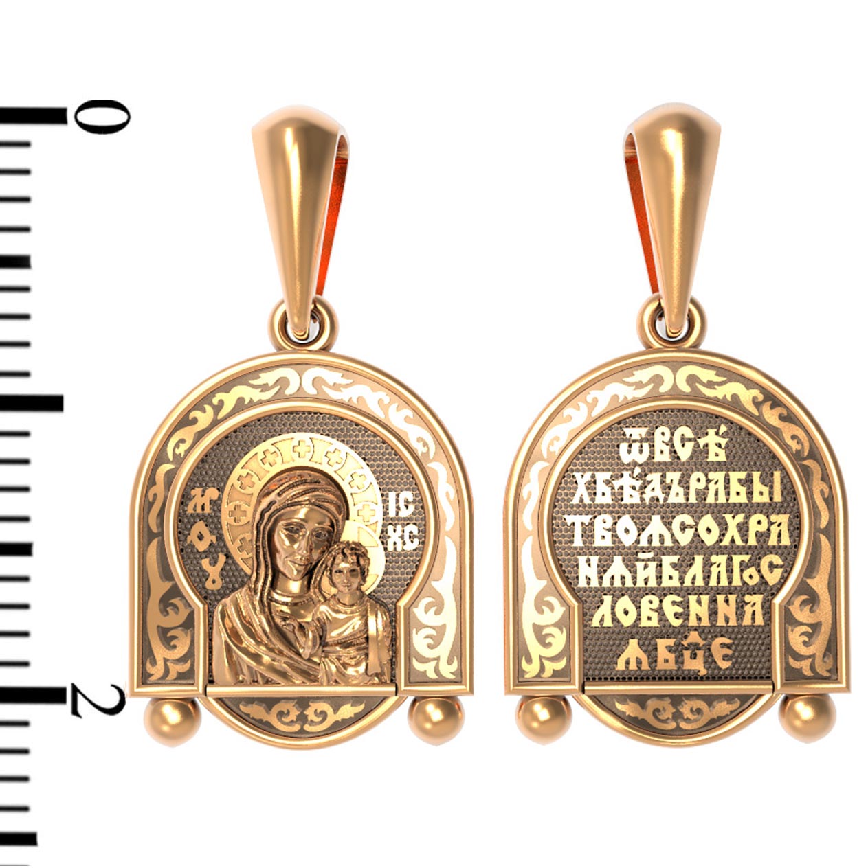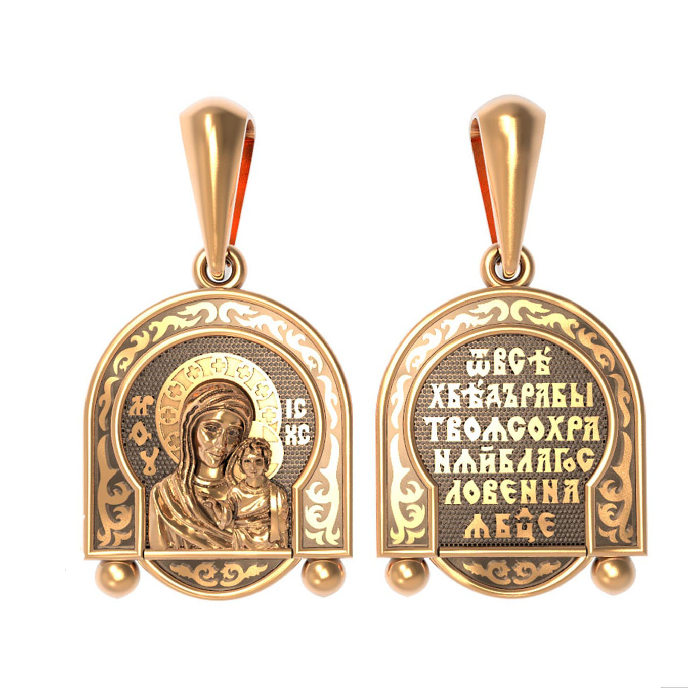 На лицевой части образка изображена Казанская икона Божией Матери — одна из самых почитаемых в России чудотворных икон Богородицы. Богословское значение Казанской иконы — указать верующим истинный Путь к спасению, который лежит через Христа. Только Божия Матерь имеет настолько сильное дерзновение к Спасителю, что может ходатайствовать перед Ним за всех верных. Именно этот образ дарится новой повенчанной паре, как хранитель очага и семейная реликвия. Молитва перед Казанской иконой Божьей Матери помогает во всех сложных случаях жизни, в болезнях, во всех печалях, невзгодах, скорбях. Уникальная история появления, чудеса, случившиеся по молитвам православных людей возле образа — все это делает Казанскую Богородицу особенной, среди тысяч других икон.
