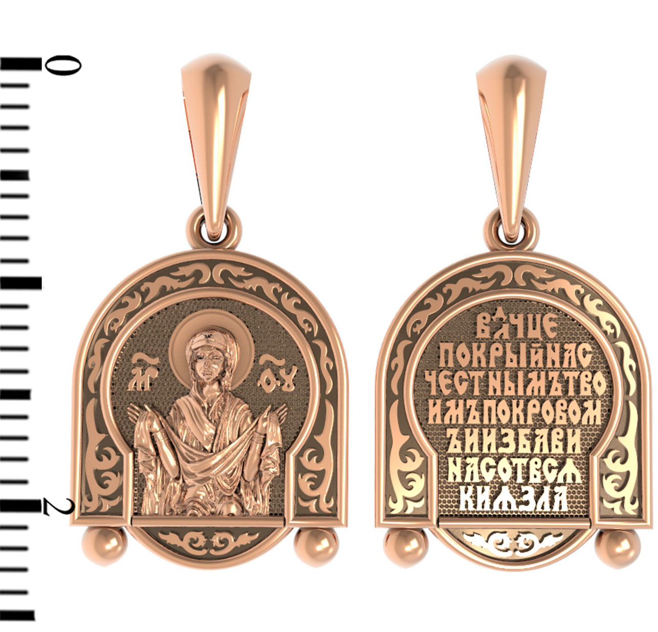 На лицевой части образка изображена икона Покров Пресвятой Богородицы. Праздник Покрова Божией Матери является воспоминанием чуда, которое произошло во Влахнернской церкви 1 (14) октября 910 года: Пресвятая Богородица явилась верующим над алтарем храма и распростерла над ними Свое покрывало. В этот день Божья Матерь открыла людям, что Она является Ходатаицей за них перед Богом. Богородица простирает Свой молитвенный покров над всеми православными христианами и умоляет Сына Своего о даровании вечного спасения каждому человеку.