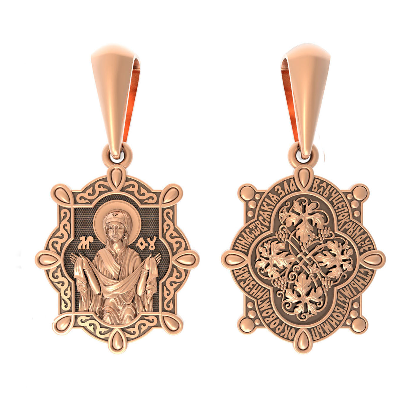 На лицевой части образка изображена икона Покров Пресвятой Богородицы. Праздник Покрова Божией Матери является воспоминанием чуда, которое произошло во Влахнернской церкви 1 (14) октября 910 года: Пресвятая Богородица явилась верующим над алтарем храма и распростерла над ними Свое покрывало. В этот день Божья Матерь открыла людям, что Она является Ходатаицей за них перед Богом. Богородица простирает Свой молитвенный покров над всеми православными христианами и умоляет Сына Своего о даровании вечного спасения каждому человеку.