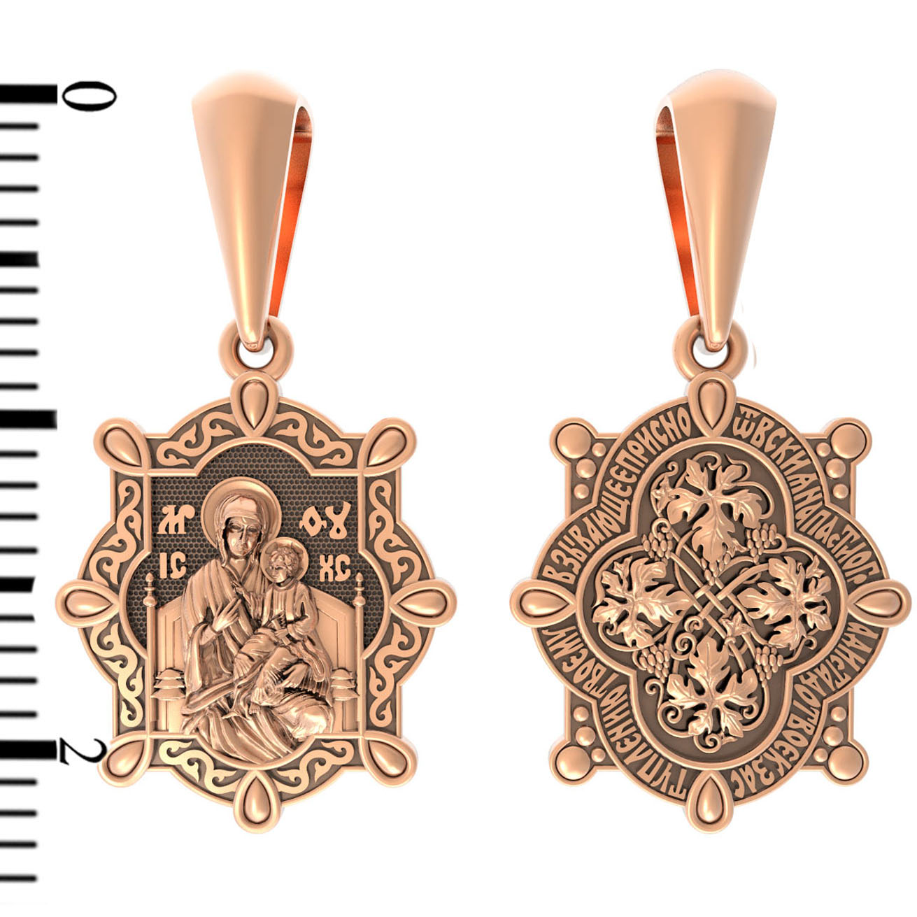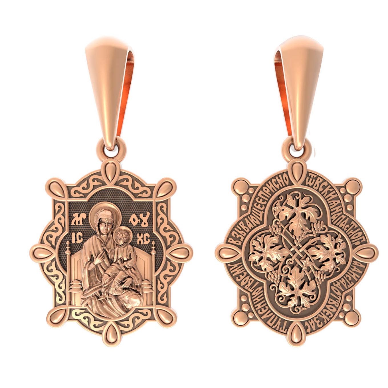 На оборотной стороне изображена виноградная лоза — символы церкви и евхаристии. «Я есмь лоза, — говорил Иисус Христос Своим ученикам, — а вы ветви; кто пребывает во Мне, и Я в нем, тот приносит много плода» (Ин. 15, 5), «Я есмь истинная виноградная лоза, а Отец Мой — виноградарь». Вокруг образка написана молитва Богородице в честь Ее иконы «Всецарица» (Пантанасса): «От всякия напасти огради стадо Твое, к заступлению Твоему взывающее присно».