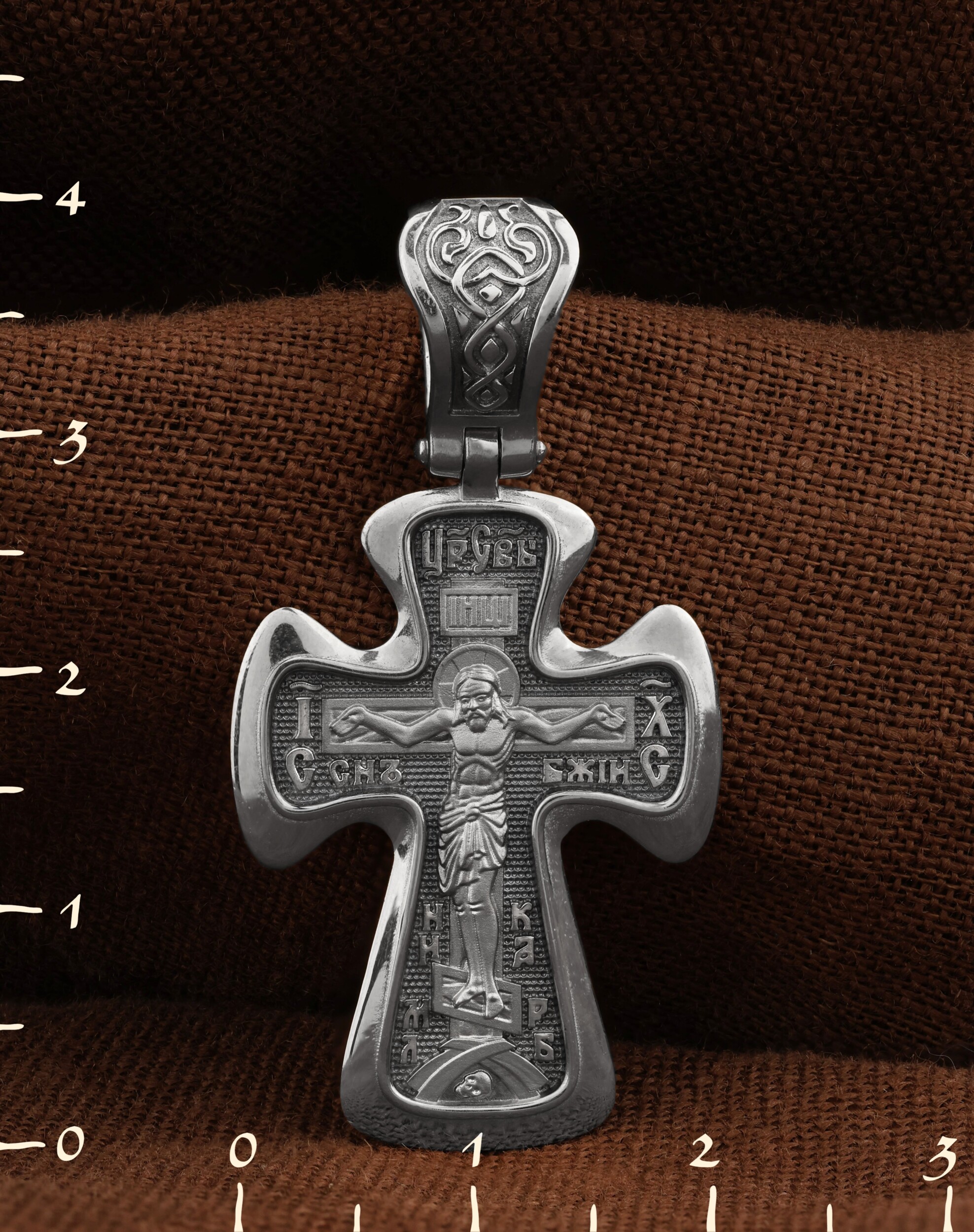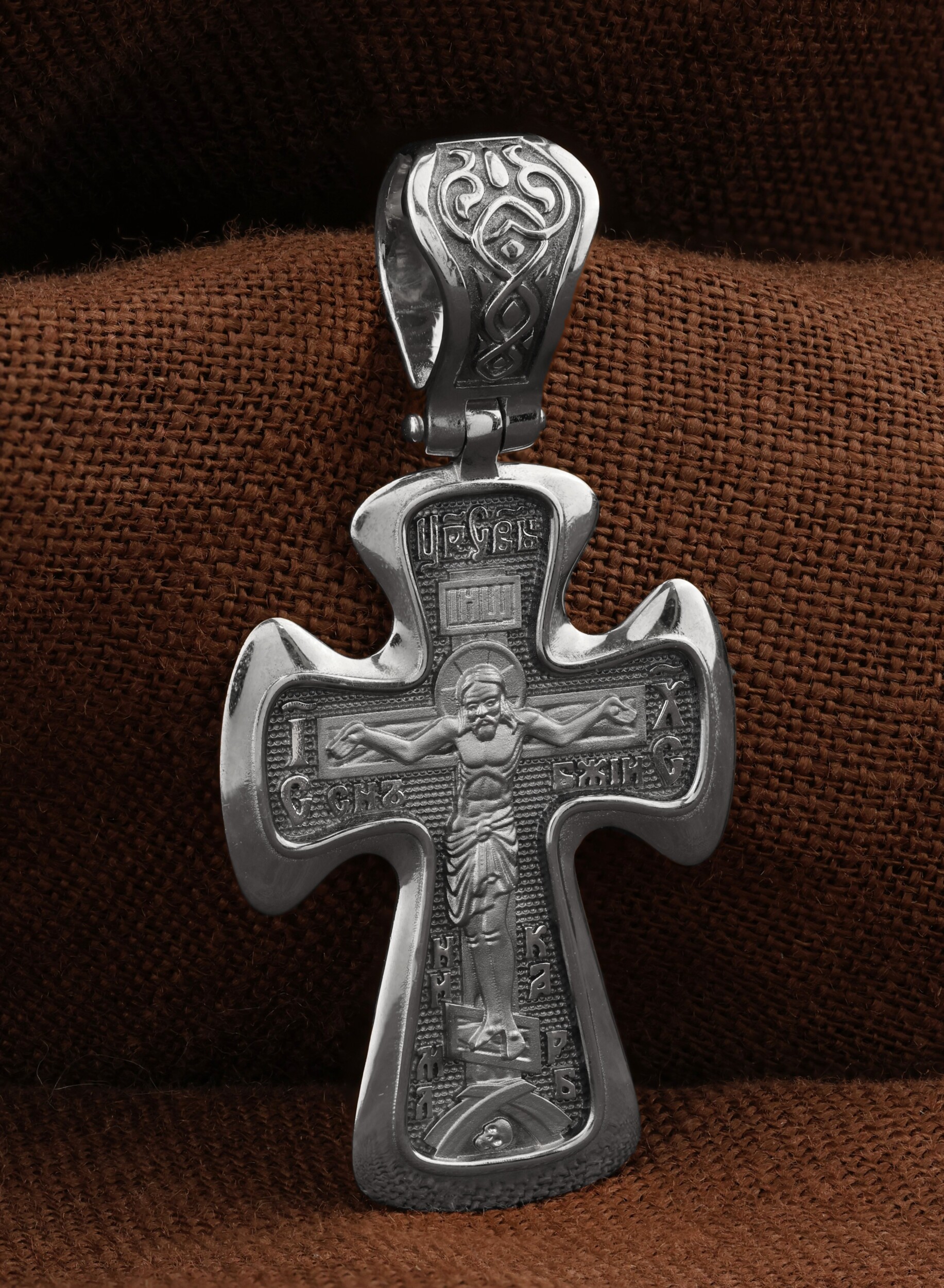 На лицевой стороне креста изображено Распятие Иисуса Христа. Господь представлен свободно покоящимся на кресте с простертыми руками и как бы обнимающим всю Вселенную. Он — Спаситель, искупивший грехи мира, «поправший смертию смерть» и призывающий к Себе «все концы земли». Поэтому рядом с Его образом помещены слова — «НИКА» и «Царь Славы». Эти слова характеризуют Господа как Великого Архиерея, победителя смерти. Также Распятие сопровождается надписями, олицетворяющими Христа. Это святое имя Христа «IC» (Иисус) «ХС» (Христос), и словосочетание «СЫН БОЖИЙ».