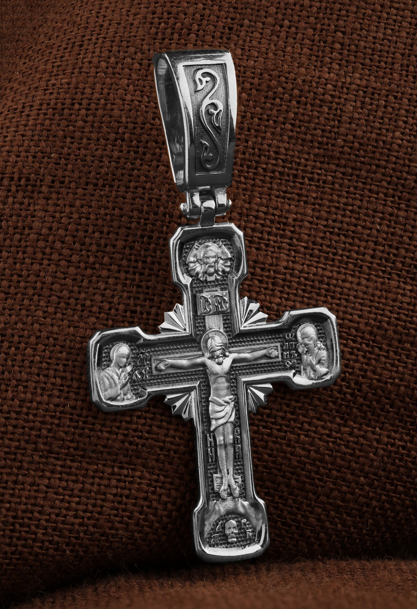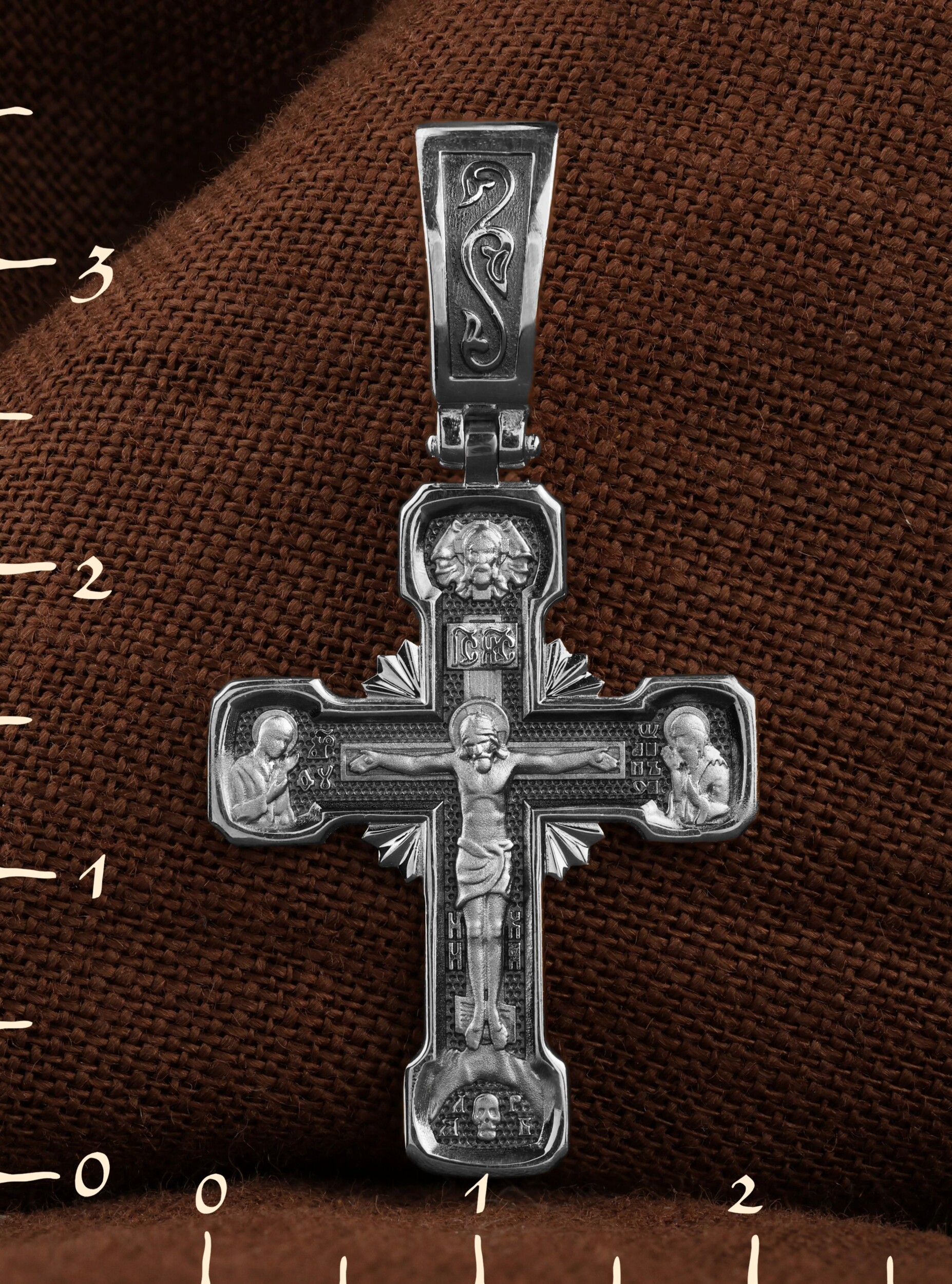 На лицевой стороне креста изображено Распятие Господа Иисуса Христа. Верхняя перекладина символизирует собой табличку с надписью «IHЦI» — Иисус Назарянин Царь Иудейский. Ниже перекладины добавляется: «НИКА» (греч. — Победитель). Возвышение, на котором стоит Крест, символизирует гору Голгофу, на которой произошло Распятие. У подножия Креста изображают прах Адама, обозначенный черепом.