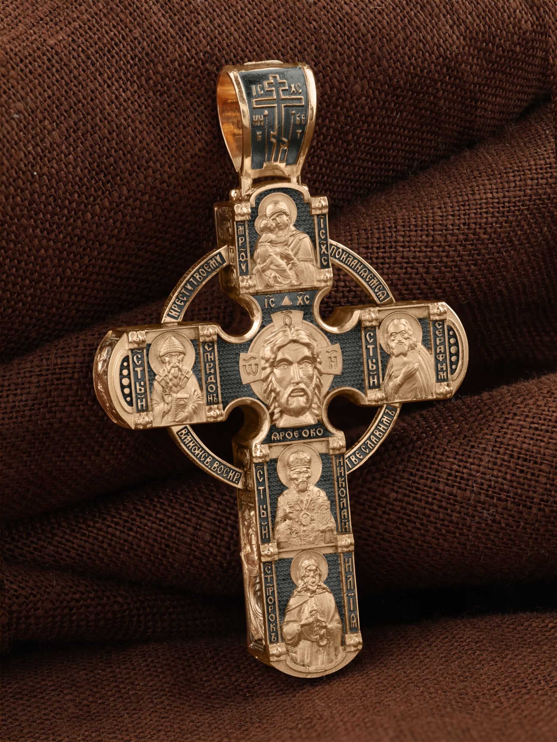 Крест объединяет в одной фигуре два христианских символа — круг-нимб и крест. На лицевой стороне креста изображено Распятие Господа и Спасителя нашего Иисуса Христа. Крест — символ спасения и искупления рода человеческого, знамение победы над смертью и адом. Распятие сопровождается каноническими надписями. На верхней табличке, выше головы Иисуса, расположена надпись, составленная Понтием Пилатом — «IНЦI». Она означает «Иисус Назорей, Царь Иудейский». Надписи «IC» «ХC», что означает Иисус Христос и «Сын Божий» размещается на разных сторонах поперечной перекладины креста. Вдоль Распятия размещены надписи «Царь Славы», «НИКА» (греч. — Победитель) и «МЛРБ» — «место лобное рай бысть» означает место лобное стало раем». Крест стоит на горе камней, символизирующих Голгофу. В ее основании различается череп — это голова Адама. Вдоль креста изображены орудия Страстей Христовых: копие сотника Лонгина, которым пронзили подреберье мёртвого Иисуса, чтобы убедиться в Его смерти, и трость с губкой, с которой Иисуса напоили уксусом. Они обозначены буквами «К» и «Т». Слева от Распятия помещены лики Пречистой Богородицы и Апостола Петра, справа изображены Апостол и евангелист Иоанн Богослов и Апостол Павел. Над Распятием изображен Святой Ангел-Хранитель, ниже — икона Божией Матери «Семистрельная». По кругу размещена молитва: «Кресту Твоему поклоняемся, Владыко, и Святое Воскресение Твое славим». На кулонном кольце помещено изображение Креста «Голгофа», на котором был распят Господь и Спаситель наш Иисус Христос.