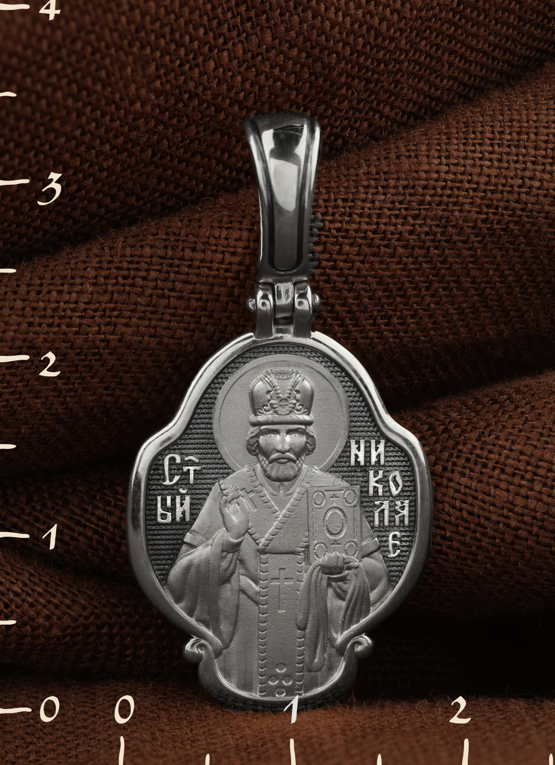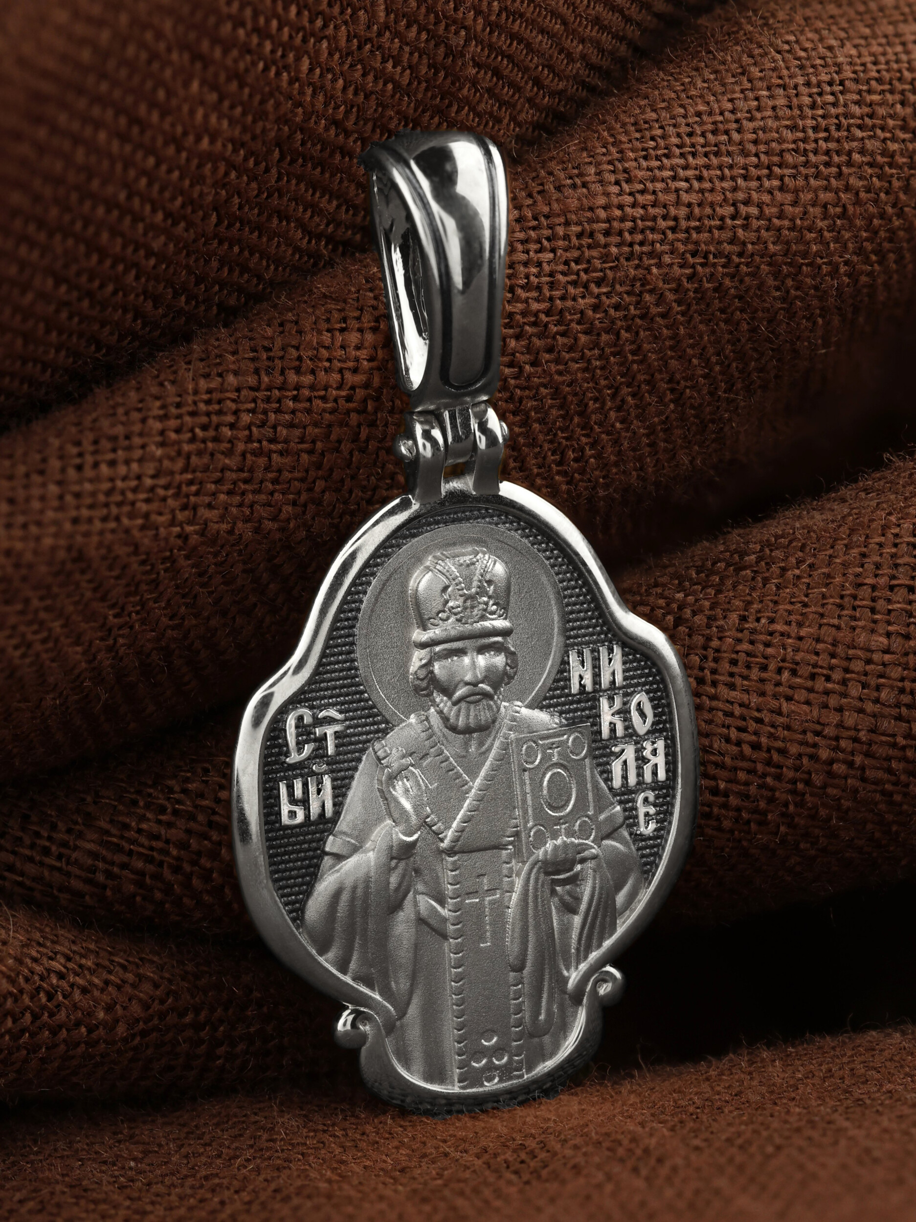 Лицевую сторону возглавляет икона святителя Николая Чудотворца. Святитель Николай родился во второй половине III века в Малой Азии в Ликийском городе Патары. С рождения Божий Угодник проявлял необыкновенные дарования. Сохранилось Предание, что во время крещения он, никем не поддерживаемый, простоял в купели три часа. С детства святитель избегал пустых развлечений, любил молитву, прекрасно учился и проводил свободное время за чтением Священного Писания. По достижении зрелого возраста жители Патар выбрали его своим пресвитером. Несколько лет спустя св. Николай стал епископом в городе Миры, столице Ликии.