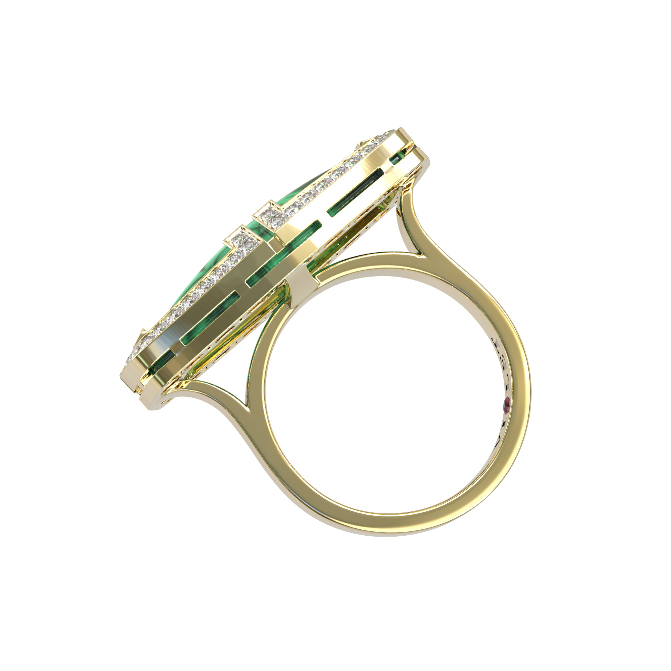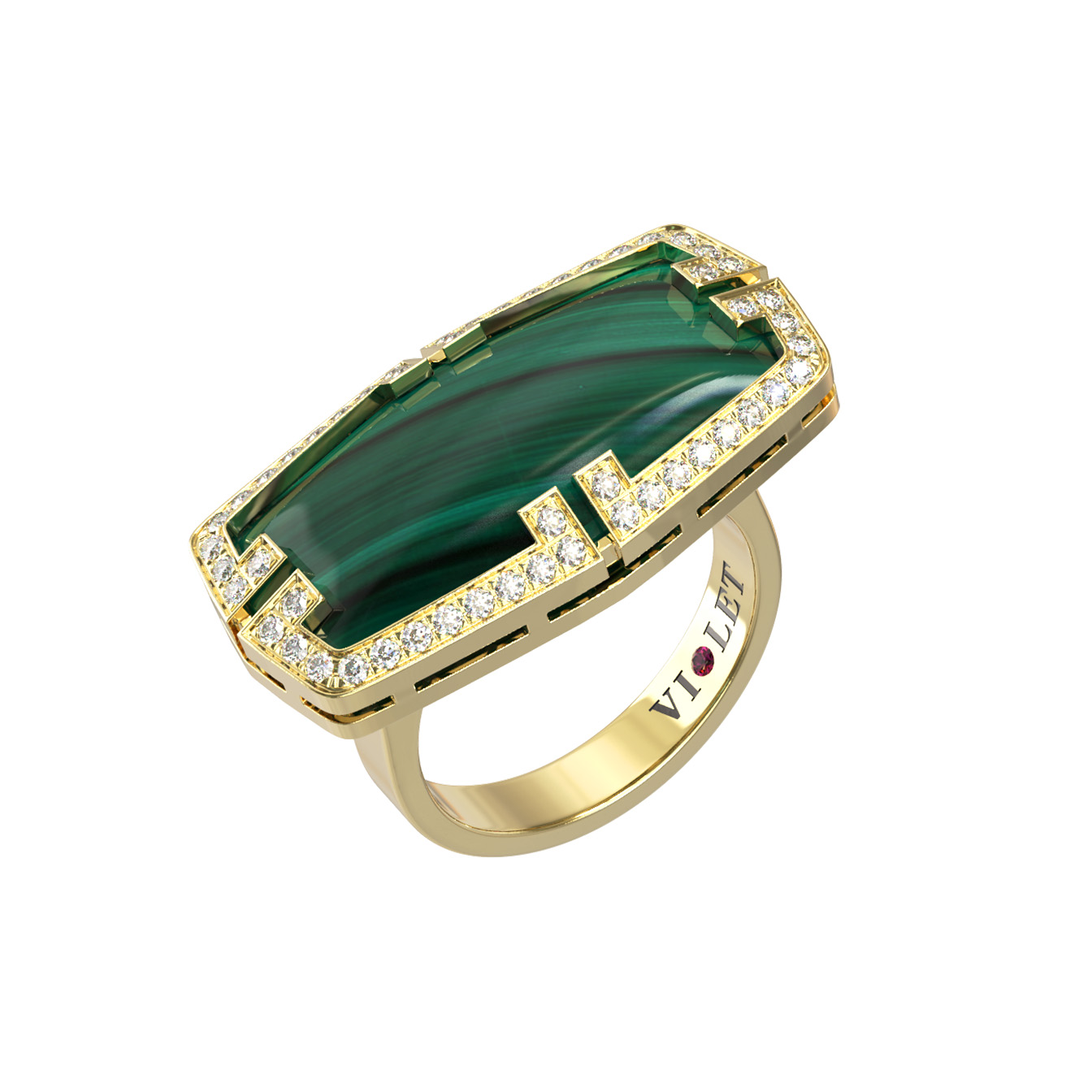 Кольцо из лимонного золота c бриллиантами, рубином и малахитом