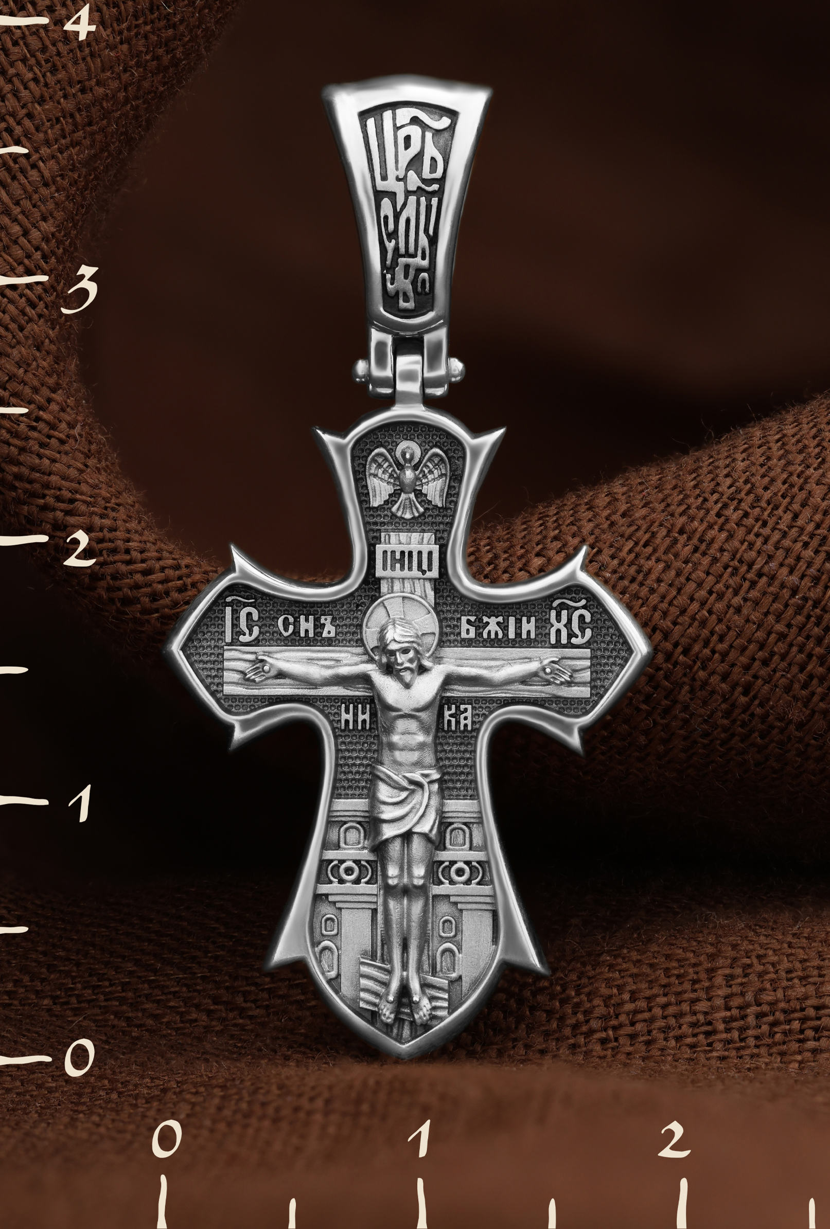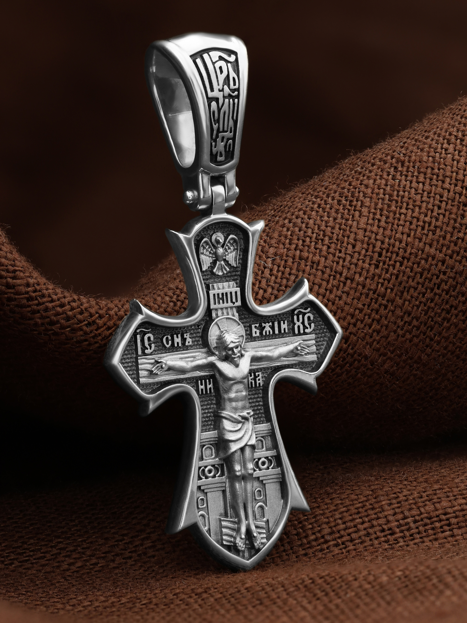 На лицевой стороне креста изображено распятие Господа нашего Иисуса Христа. Позади Распятия видна иерусалимская стена, знак того, что Господь был распят вне стен города. Но вместе с тем стена символизирует и Небесный Иерусалим, путь который открылся для человека через Голгофу. На кулоном кольце видим слова «ЦРЬ СЛВЫ» — Царь Славы. Верхняя перекладина символизирует собой табличку с надписью «IHЦI» — Иисус Назарянин Царь Иудейский. Над перекладиной пишется сокращенно имя Спасителя «IC XC» — Иисус Христос и словосочетание «СНЪ БЖIЙ» — «СЫН БОЖИЙ». Рядом с образом Христа помещены слова — «НИКА» (греч. — Победитель). Возвышение, на котором стоит Крест, символизирует гору Голгофу, на которой произошло Распятие. У подножия Креста изображают прах Адама, обозначенный черепом.