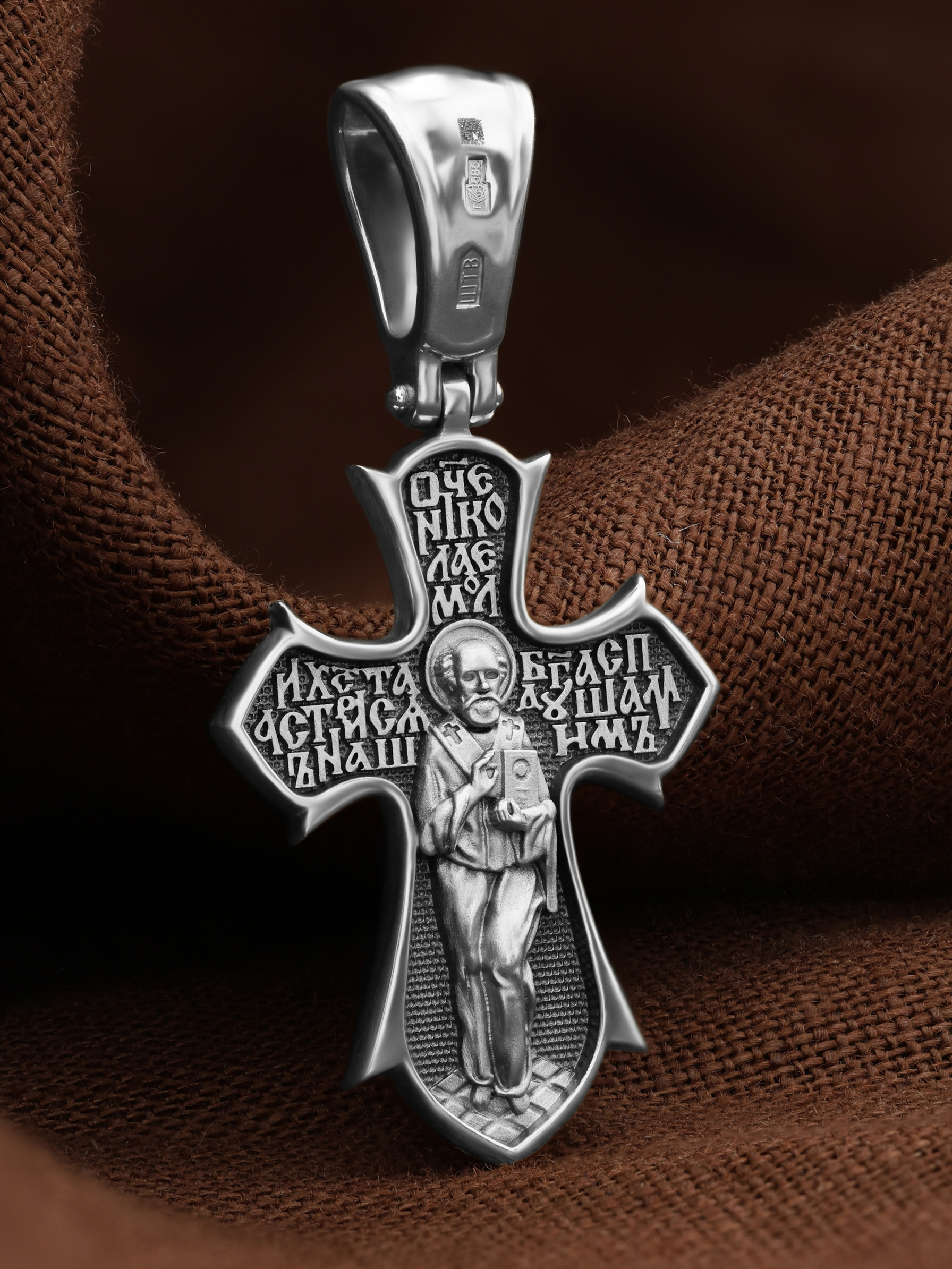 Оборотную сторону креста возглавляет икона Святителя Николая Чудотворца, которого еще называют Николай Угодник за то, что он угодил своей жизнью Богу. Николай Чудотворец, помощник в делах, покровитель учащихся, утешитель обиженных. Также Святитель Николай Чудотворец известен своими молитвами за путешественников, когда непрестанный ветер и бушующие волны утихают и корабль заходит в спокойную гавань. На кресте написана молитва: «Отче Николае, моли Христа Бога спастися душам нашим».
