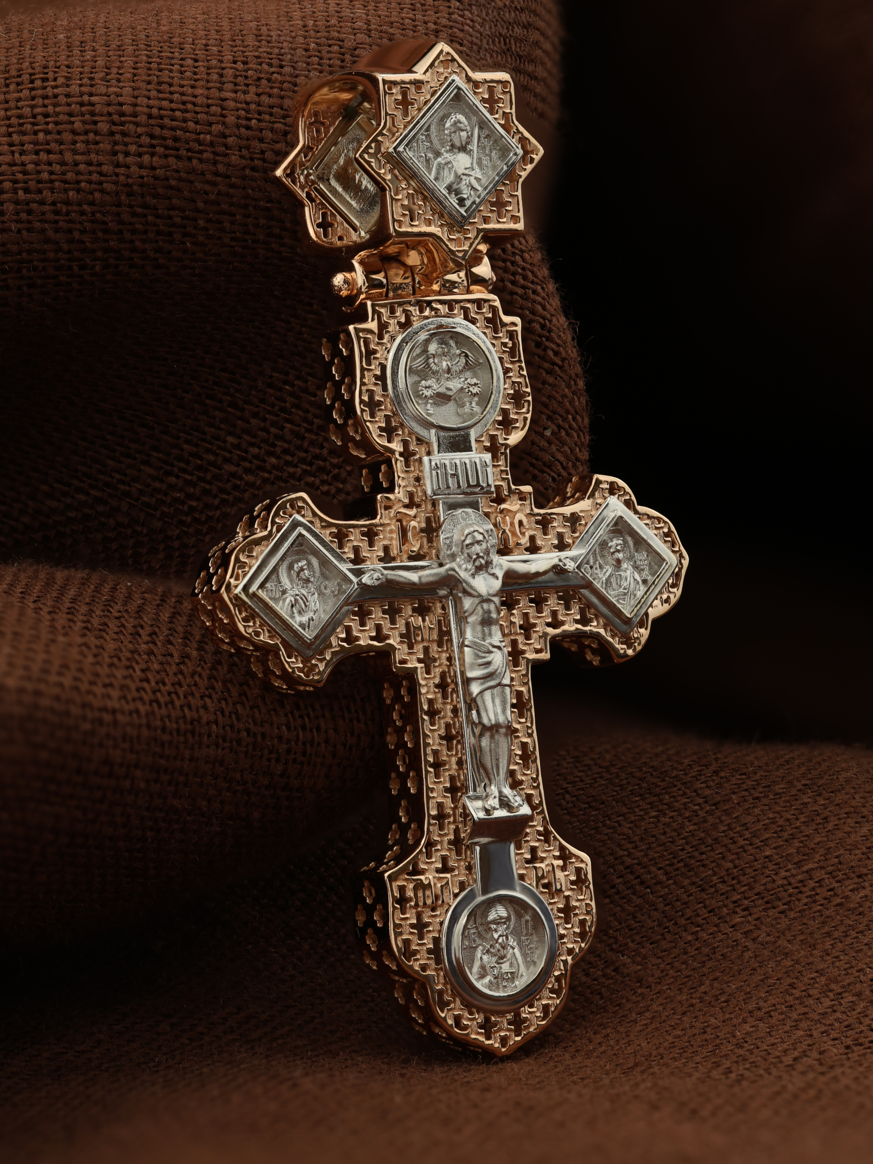 На лицевой стороне креста изображено Распятие Господа и Спасителя нашего Иисуса Христа. Крест- символ спасения и искупления рода человеческого, знамение победы над смертью и адом. Иисус Христос, как искупительная жертва освобождения человечества от власти греха, умер крестной смертью и в третий день воскрес. На верхней табличке, выше головы Иисуса, расположена надпись, составленная Понтием Пилатом — «IНЦI». Она означает «Иисус Назорей, Царь Иудейский». Над перекладиной написано сокращенно имя Спасителя «IC» «XC» — Иисус Христос. Ниже перекладины написано слово «НИКА» (греч. — Победитель). Слева от Распятия помещен лик Пречистой Богородицы, скорой помощницы и заступницы рода Христианского. Слева изображен апостол и евангелист Иоанн Богослов, один из ближайших учеников Иисуса Христа. Над Распятием изображение Этимасии (греч. — готовность) — престола, уготованного для второго пришествия Господа Иисуса Христа, грядущего вершить Суд над живыми и мертвыми (Пс.IX,5−8). Ниже Распятия размещен образ Святителя Спиридона Тримифунтского. На лицевой стороне кулонного кольца изображен Ангел Хранитель, а на оборотной стороне — слова молитвы: «Господи помилуй. Спаси и сохрани».