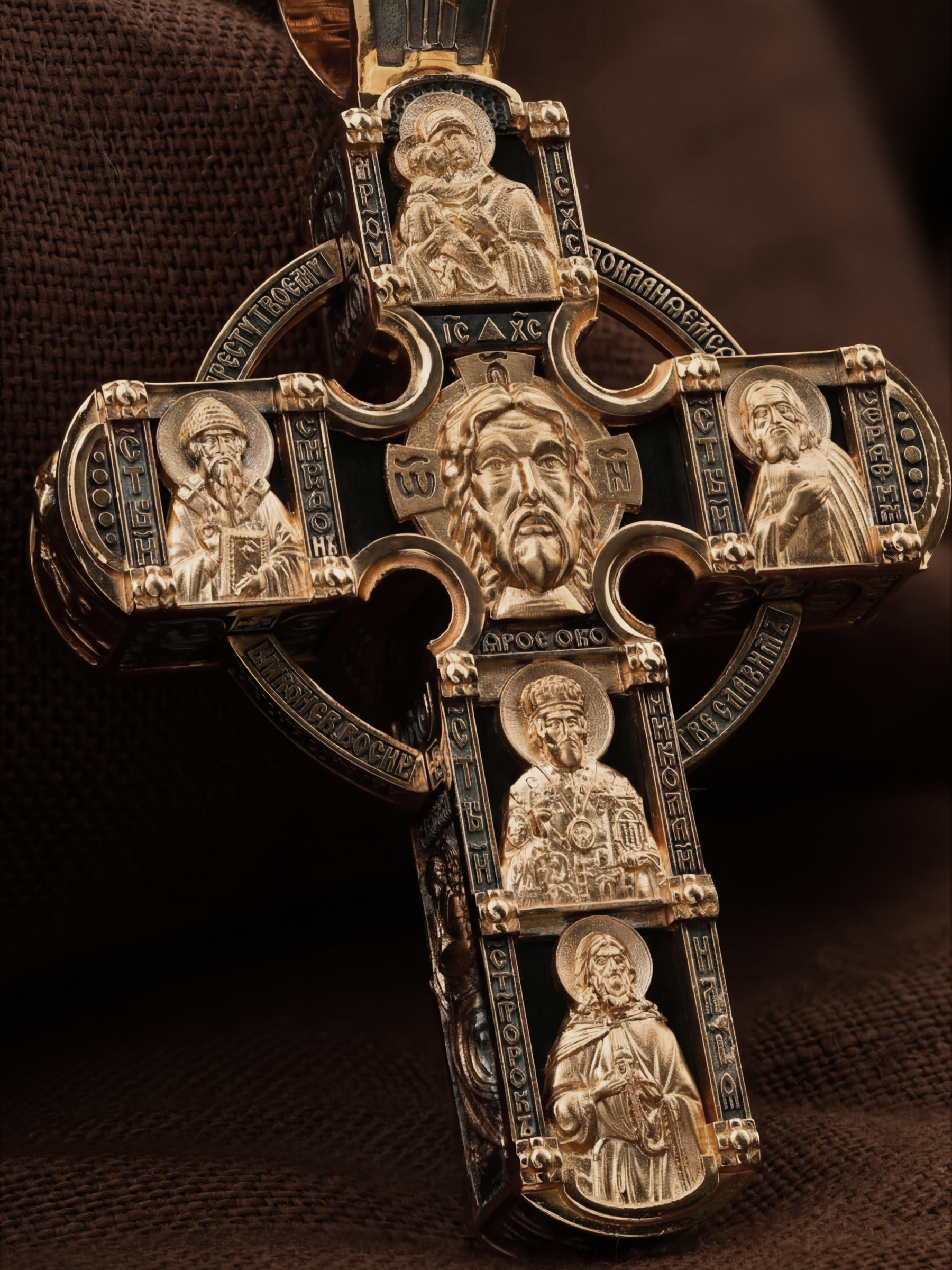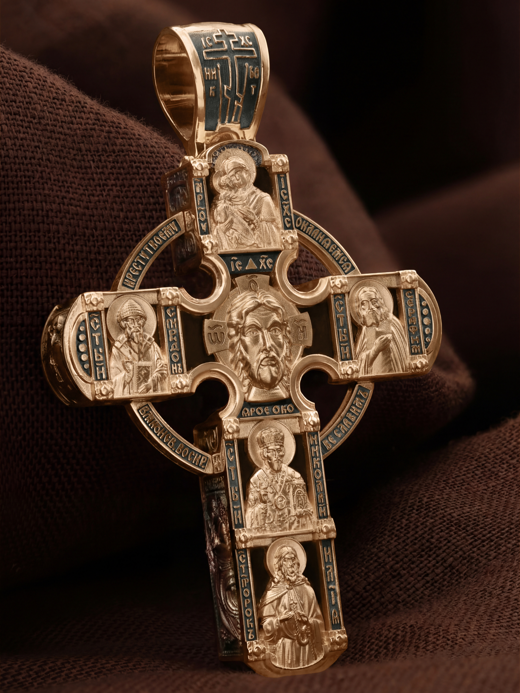В центре оборотной стороны креста размещен образ Господа и Спасителя нашего Иисуса Христа — Господь Вседержитель или Пантократор (от греч. всевластный, всесильный). Именование Иисуса «Вседержителем» указывает, с одной стороны, на Его Божественную природу: «Аз есмь Альфа и Омега, начало и конец, говорит Господь, Который есть и был и грядет, Вседержитель» (Откр. 1: 8). С другой стороны, такое именование связано и с человеческой природой Христа, искупившего крестной жертвой людские грехи и обновившего тем самым человеческую природу. Над образом изображена икона Божией Матери «Владимирская», ниже — образы святителя Николая Чудотвореца, архиепископа Мир Ликийских и пророка Ильи. Слева изображен святитель Спиридон Тримифунтский, справа — преподобный Серафим Саровский. На кулонном кольце размещен образ шестикрылого Серафима.