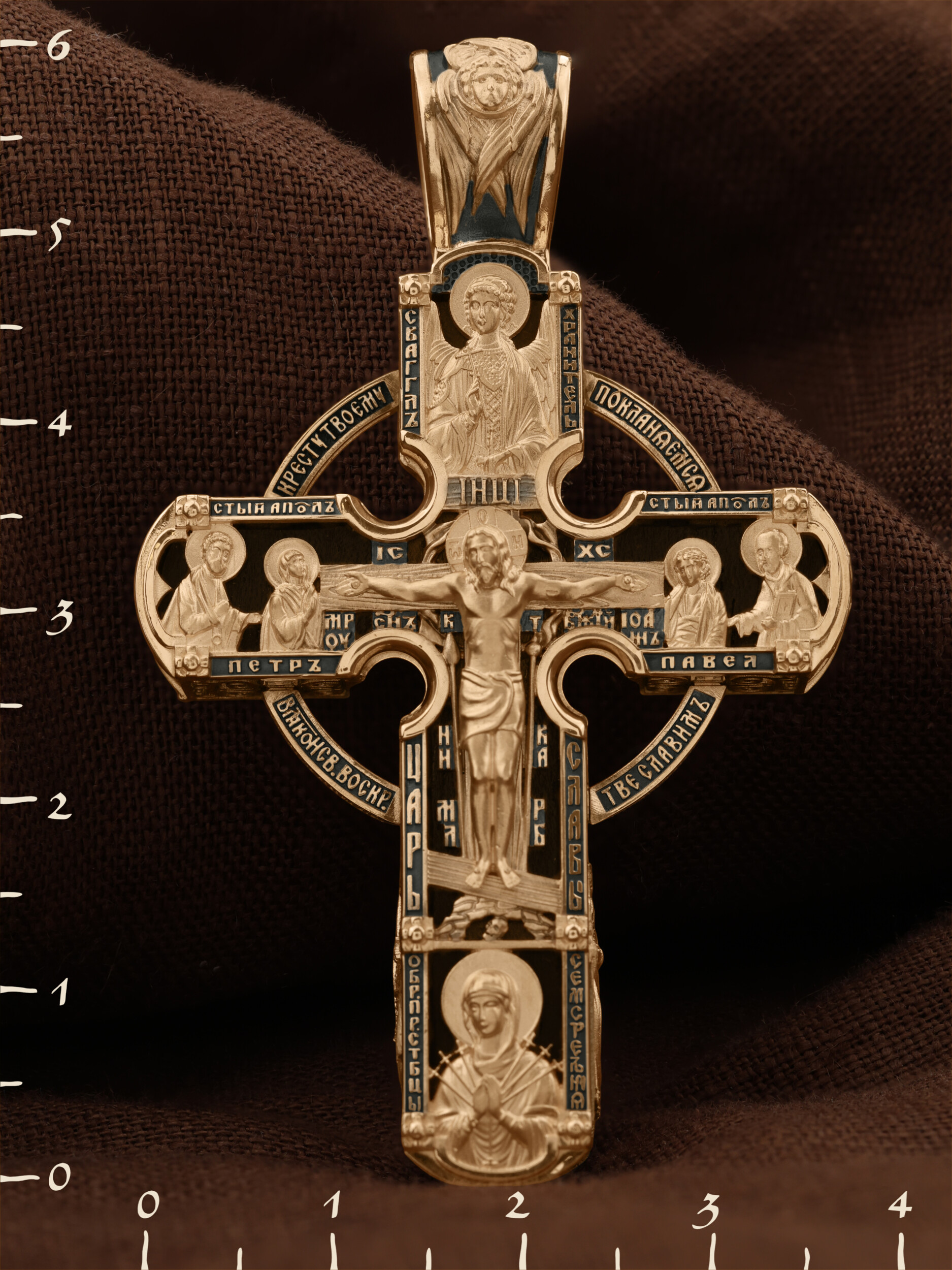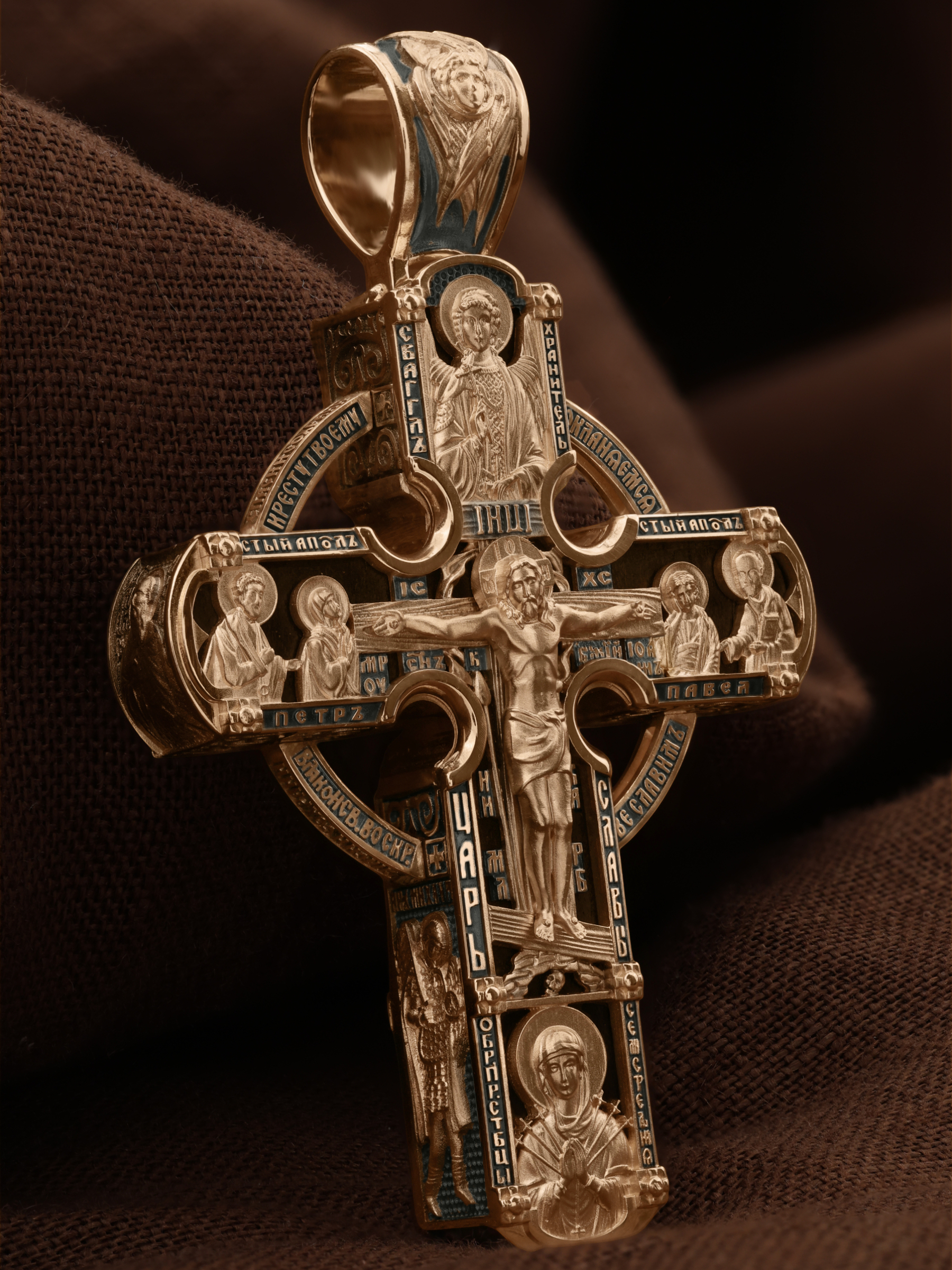Крест объединяет в одной фигуре два христианских символа — круг-нимб и крест. На лицевой стороне креста изображено Распятие Господа и Спасителя нашего Иисуса Христа. Крест — символ спасения и искупления рода человеческого, знамение победы над смертью и адом. Распятие сопровождается каноническими надписями. На верхней табличке, выше головы Иисуса, расположена надпись, составленная Понтием Пилатом — «IНЦI». Она означает «Иисус Назорей, Царь Иудейский». Надписи «IC» «ХC», что означает Иисус Христос и «Сын Божий» размещается на разных сторонах поперечной перекладины креста. Вдоль Распятия размещены надписи «Царь Славы», «НИКА» (греч. — Победитель) и «МЛРБ» — «место лобное рай бысть» означает место лобное стало раем». Крест стоит на горе камней, символизирующих Голгофу. В ее основании различается череп — это голова Адама. Вдоль креста изображены орудия Страстей Христовых: копие сотника Лонгина, которым пронзили подреберье мёртвого Иисуса, чтобы убедиться в Его смерти, и трость с губкой, с которой Иисуса напоили уксусом. Они обозначены буквами «К» и «Т». Слева от Распятия помещены лики Пречистой Богородицы и Апостола Петра, справа изображены Апостол и евангелист Иоанн Богослов и Апостол Павел. Над Распятием изображен Святой Ангел-Хранитель, ниже — икона Божией Матери «Семистрельная». По кругу размещена молитва: «Кресту Твоему поклоняемся, Владыко, и Святое Воскресение Твое славим». На кулонном кольце помещено изображение Креста «Голгофа», на котором был распят Господь и Спаситель наш Иисус Христос.