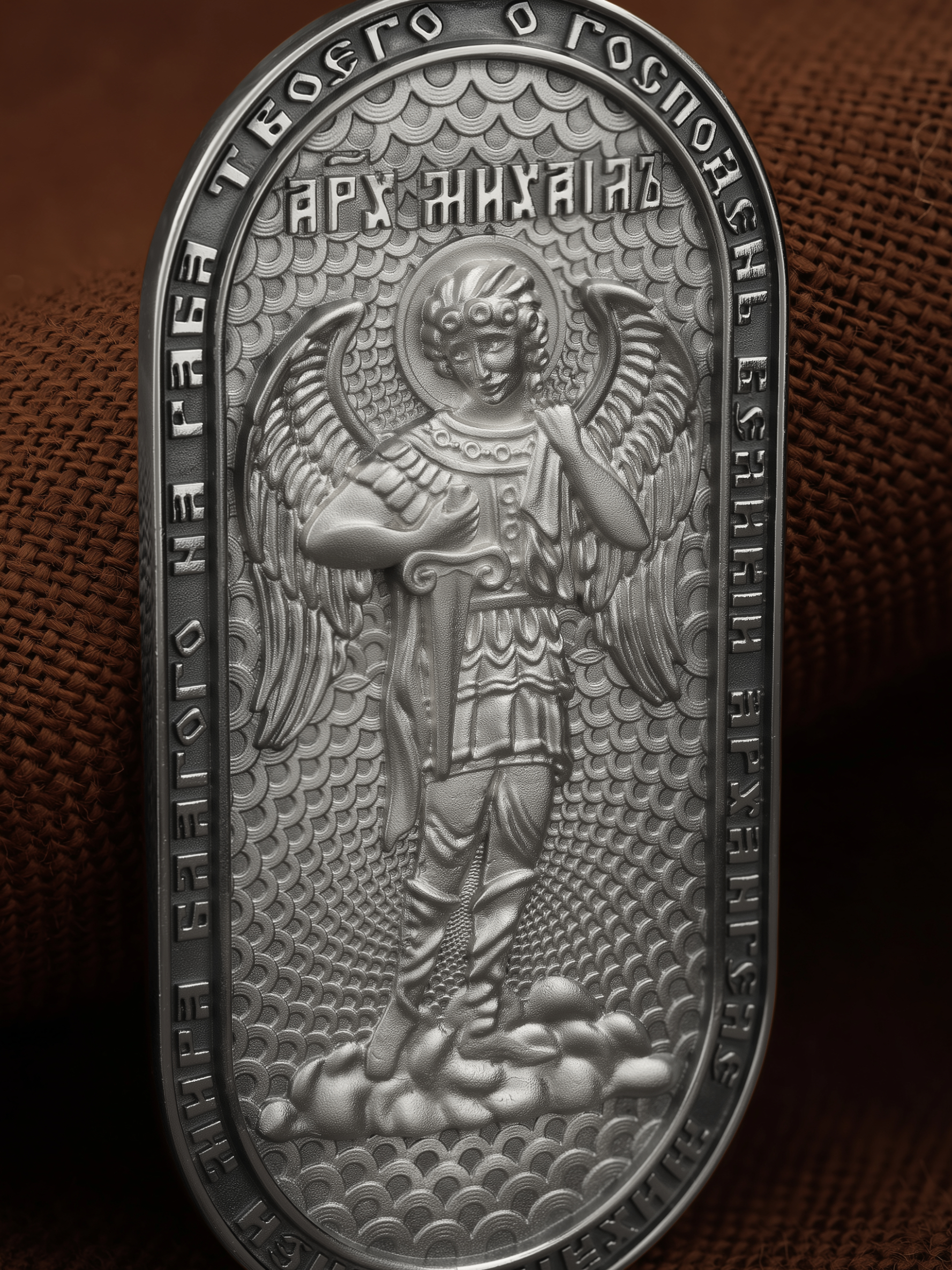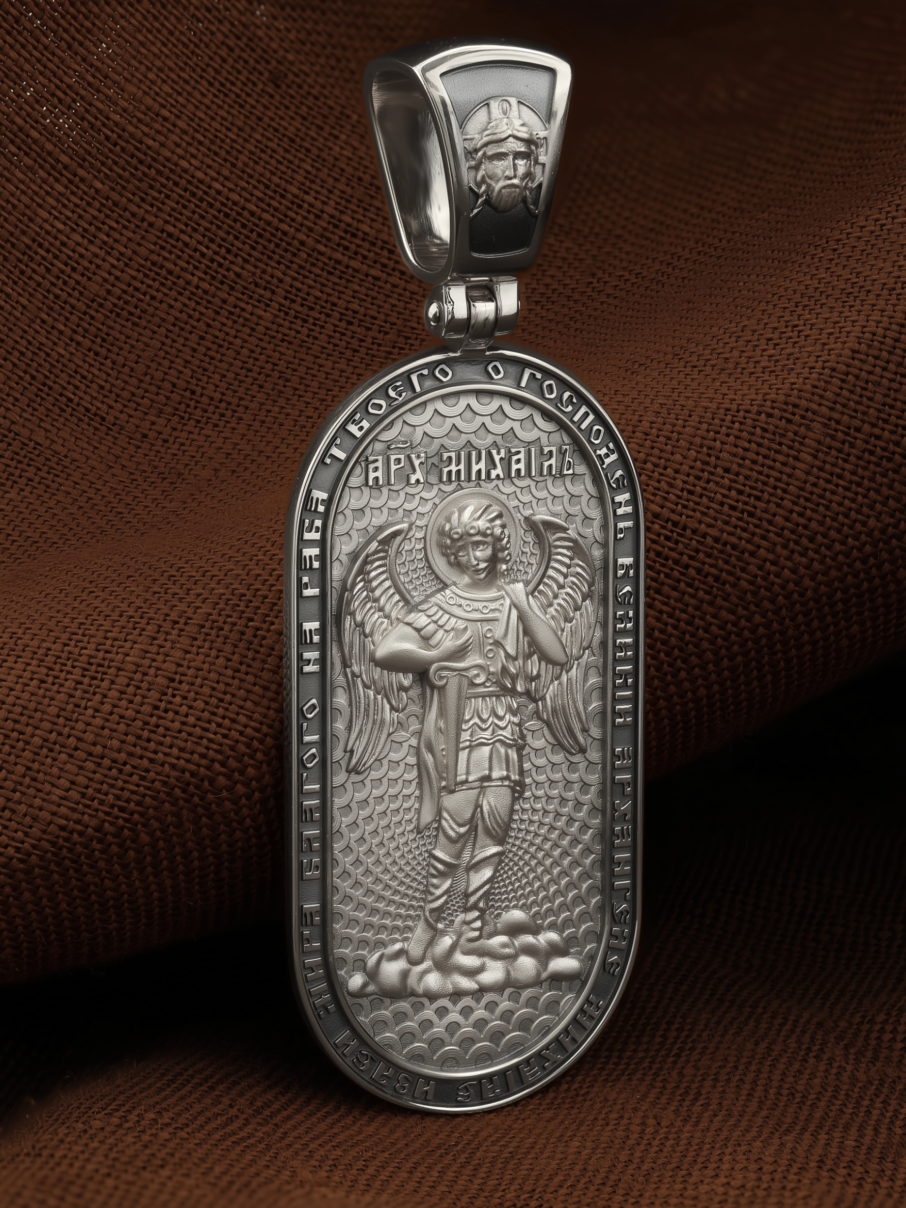 Основой композиции оборотной стороны является ростовое изображение Архангела Михаила — Архистратига всех Небесных Воинств. Он ведет непримиримую войну против сил зла, охраняет райские врата и защищает души людей. По контуру написана молитва: «О, Господень Великий Архангеле Михаиле, излей мира благого на раба Твоего». На кулонном кольце изображен Спас Нерукотворный — Символ вочеловечившегося Божества.