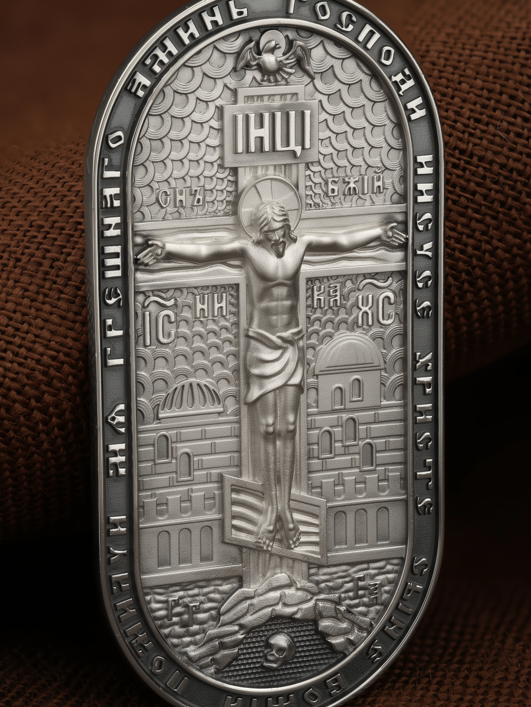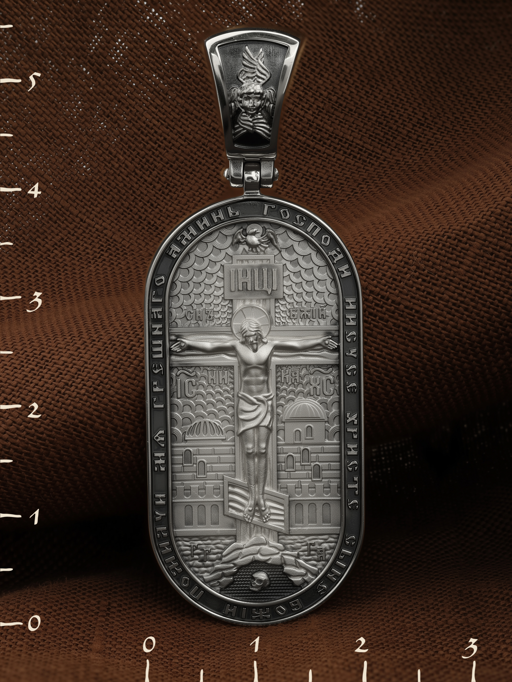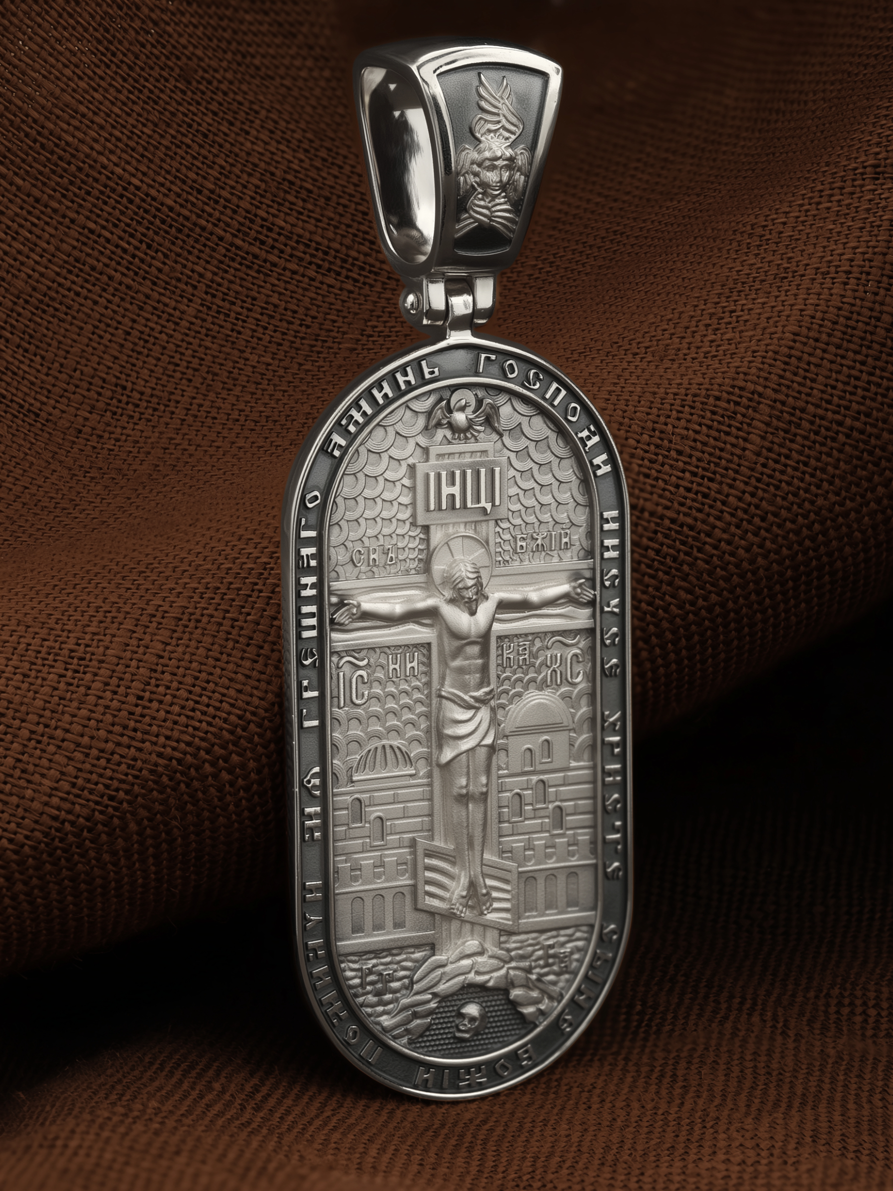 Центральную часть лицевой стороны занимает Распятие Христа — образ жертвы, принесенной Господом за грехи людей. Именно ко Христу, сошедшему на землю ради нашего спасения, возносятся все молитвы. Рядом с Его образом помещены слова — «НИКА» (греч. — Победитель) и «СЫН БОЖИЙ». Эти слова характеризуют Господа как Великого Архиерея, победителя смерти. Также Распятие сопровождается надписями, олицетворяющими Христа — это святое имя Христа «IC» (Иисус) «ХС» (Христос). Верхняя перекладина символизирует собой табличку с надписью «IHЦI» — Иисус Назарянин Царь Иудейский. Возвышение, на котором стоит Крест, символизирует гору Голгофу, на которой произошло Распятие. У подножия Креста изображают прах Адама, обозначенный черепом. На кулонном кольце изображен шестикрылый Серафим — самый приближенный к Господу Ангел. По контуру образка написана молитва: «Господи Иисусе Христе, Сыне Божий, помилуй мя грешного. Аминь»