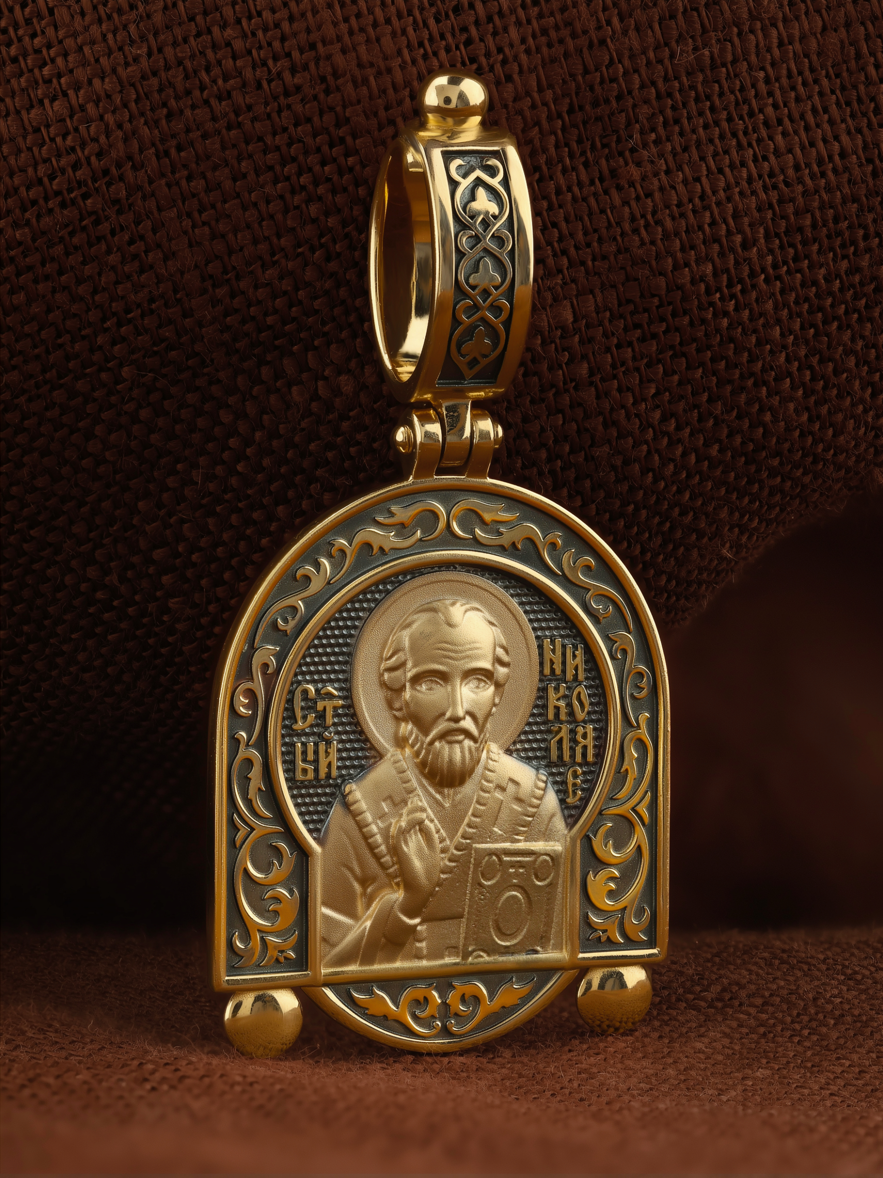 На лицевой стороне образка изображен Святитель Николай архиепископ Мир Ликийских, Чудотворец. Он является одним из самых почитаемых святых в православном мире. Святитель Николай родился во второй половине III века в Малой Азии в Ликийском городе Патары. С рождения Божий Угодник проявлял необыкновенные дарования. Сохранилось Предание, что во время крещения он, никем не поддерживаемый, простоял в купели три часа. Приняв сан священника, святитель Николай стал проводить еще более строгую подвижническую жизнь. Избранник Божий Николай стал вершиной всех добродетелей, поднятой до райской высоты. С кем из величайших праведников не сравнялся он образом духовной красоты, кому из них не последовал в своих деяниях и чудотворениях? Вся жизнь святого Николая — это служение Богу. Много великих и преславных чудес сотворил великий Святитель Николай Угодник. Он помогал сущим в бедах, укрощал штормы, спасал от потопления и выносил на сушу из глубины морской, освобождал из плена и приносил освобожденных домой, избавлял от уз и темницы, защищал от посечения мечом, освобождал от смерти и подавал многим различные исцеления: слепым — прозрение, хромым — хождение, глухим — слух, немым — дар слова.